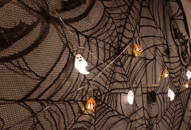 생각보다 퀄리티가 좋았던 식탁보 검은색으로 거미와 거미줄 무늬가 있어 이것만 깔았는데도 할로윈 분위기가 났어요.