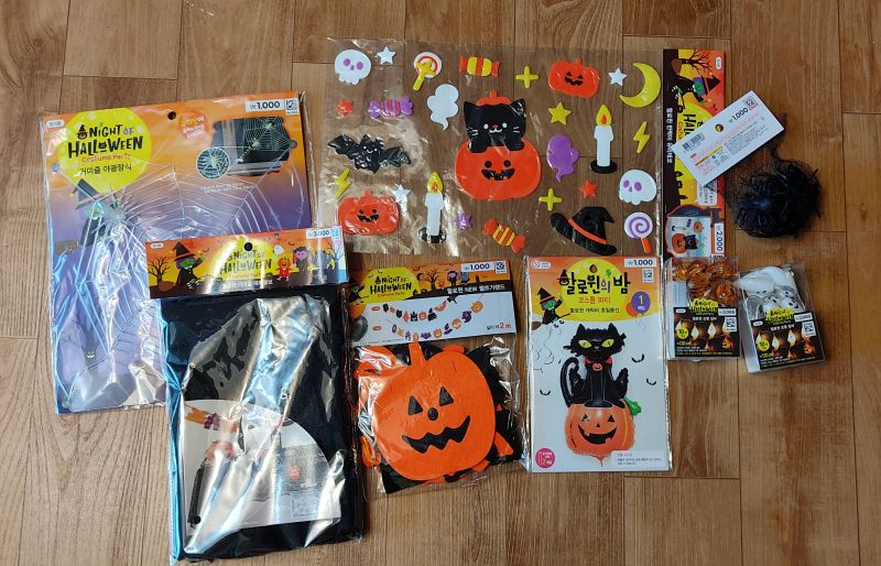 분장을 할 수 있는 가면, 망토, 분장 스티커, 도끼, 지팡이 등이 있고, 인테리어 소품으로 가랜드, 거미줄, 호박바구니, 랜턴, 풍선 등이 있었어요. 대부분 아이들이 무서워하지 않을 정도의 귀여운 물건들이 많았고, 조명 용품이 괜찮은 게 많았어요. 실제로 집을 꾸몄을 때도 조명이 가장 만족스러웠어요.