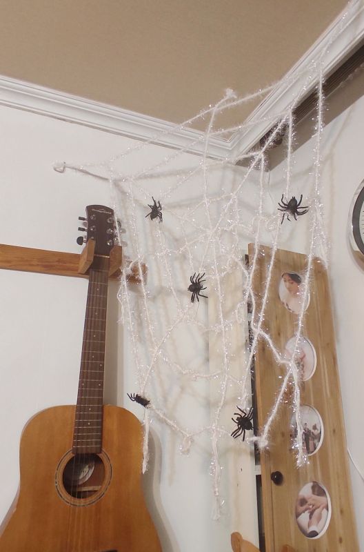거미도 할로윈 분위기를 내주죠 하얀 거미줄을 천장에 핀셋을 이용해서 달아줍니다. 작은 거미 모양도 실을 이용해 매달아 주었습니다. 다른 거미줄은 야광에 흡착판으로 되어 있어 구매해보았어요 그냥 유리창에 착 붙여주면 되니 엄청 편합니다.