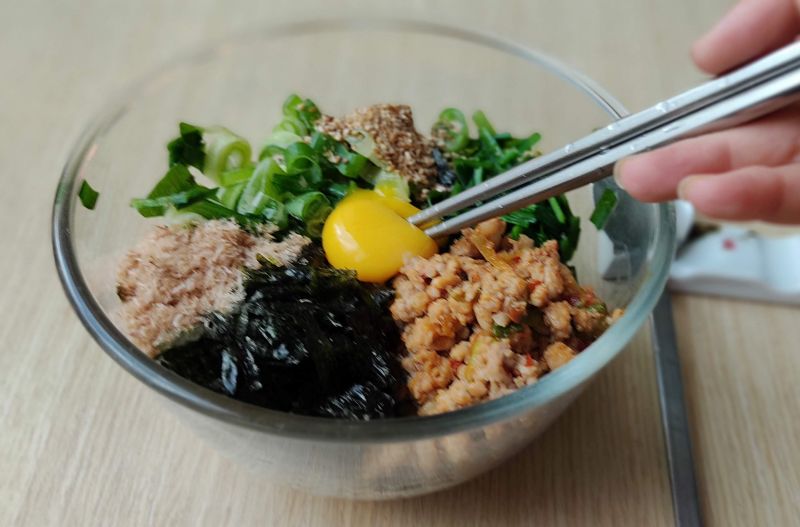 계란 노른자를 터트려 마구마구 비벼주세요. 고기에서 나온 기름과 노른자가 섞여 끈적끈적 꾸덕한 맛이 납니다. 식당에서 파는 것과 아주 똑같진 않지만 80% 정도 비슷한 맛이에요.