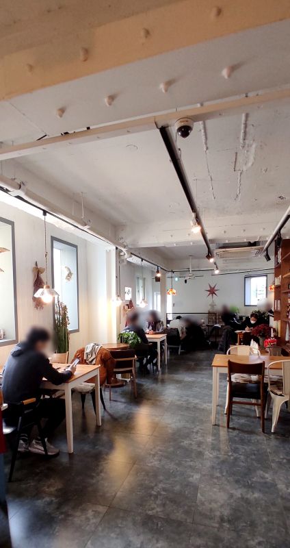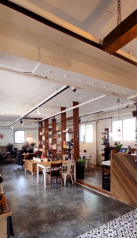 한층을 쓰는 카페로 규모가 크지 않아요. 하지만 천장을 터서 개방감을 주고 가운데 책장을 중심으로 왼쪽으론 에폭시 바닥을 한쪽과 예전 교실에서 쓰는것같은 나무 바닥으로 단을 높여서 작은 테이블을 여러 개 배치하여 전혀 좁아 보이지 않았어요.
