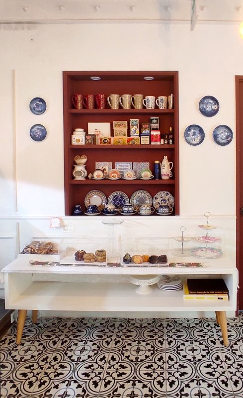 벽면 한쪽이 예쁜 찻잔과 예쁜 틴케이스에 보관된 차들이 아기자기하게 느껴집니다.