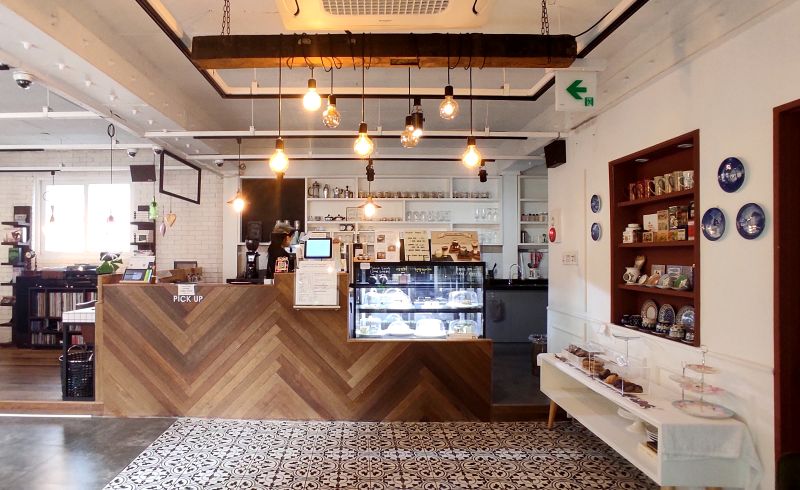 실내로 들어오몀 따듯한 감성의 카페가 펼쳐집니다. 커다란 고목에 대롱대롱 매달려있는 에디슨 전구가 가장 먼저 눈에 띄고 예쁜 바닥 타일과 소박한 카운터가 보입니다.