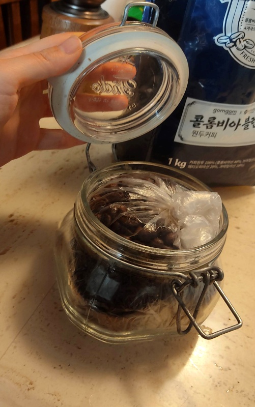 이렇게 실온에 꺼내놓은 원두는 밀폐되는 유리병에 넣어두고 있고요. 밀폐용기 여도 공기가 어느 정도 들어가기에 안쪽에 비닐을 넣고 원두를 넣어 위쪽을 돌돌 말아서 다시 한번 공기를 차단합니다. (이 비닐도 원두만 넣어놓은 것이기에 찢어지지 않는 한 재사용 중입니다.)