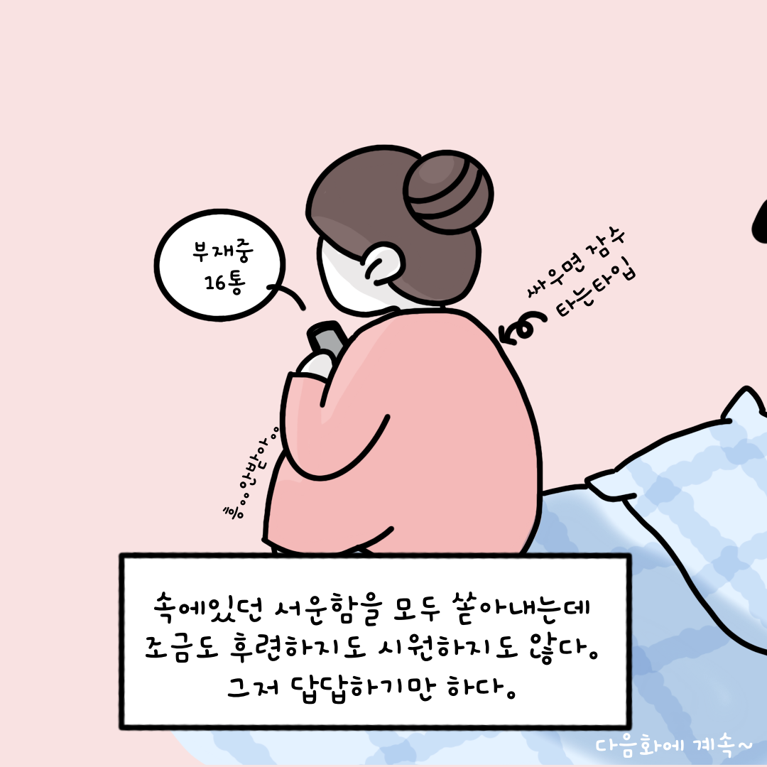 만화를 제입장에서 그려서 루나군이 굉장히 잘못해 보일 수 있지만, 사실 드레스 피팅 때 한숨도 못 잔 루나군이 온다고 하는 걸 말린 것도 저이고, 비행기표 예매를 못한 건 루나군이 회의시간에 핸드폰을 들고 갈 수 없기 때문이었습니다. 결혼 전이라는 상황이 아니었다면 꼬여버린 상황 속에 조금 속상한 정도였던 일입니다. 감정이 몰아칠 때 잠시 한 발을 떼고 천천히 생각해보는 마음가짐이 중요해요.