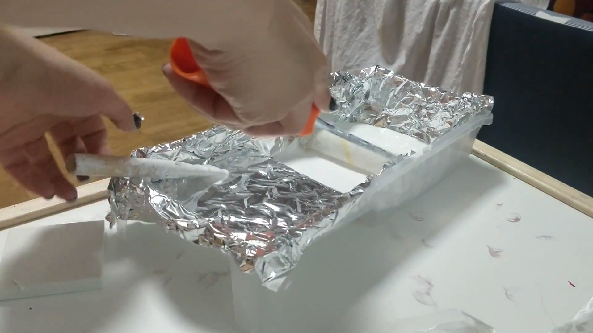 여러 번 트레이에 밀면서 골고루 펴줘야지 페인트가 별로 튀지 않고