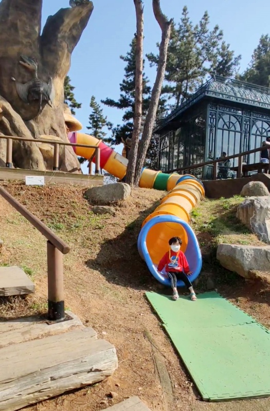 일반 작은놀이터와 동화 같은 나무 미끄럼틀이 있어 잠시 쉬면서 아이들이 노는 걸 구경할 수도 있고, 공룡 모형들이 있는 조경공간이 예뻐서 산책하기 좋았습니다.