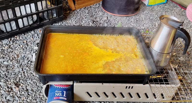 캠핑 아침은 라면이 정석이라지만 물놀이를 할 아이들을 든든하게 먹이기 위해 카레를 끓입니다. 카레는 집에서 야채와 고기를 볶은 후 카레 가루만 넣고 아주 꾸덕꾸덕하게 만들어 밀폐용기에 담아 온후 캠핑장에서 물만 더 넣어서 끓여줍니다. 이때 구이바다로 요리하면 물이 빨리 증발되며 카레 농도가 금방 맞춰져서 좋답니다.
