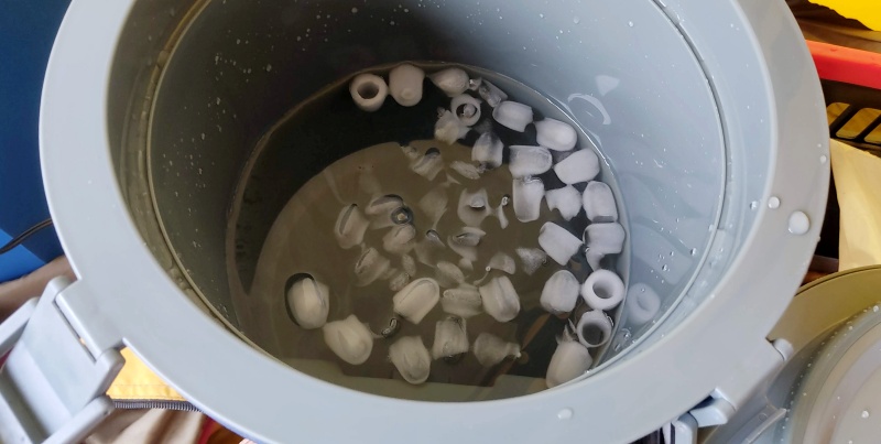 이번에 새롭게 구매한 캠핑용품! 미니 제빙기! 물놀이를 하러 간 사이에 얼음을 가득 만들어놓았네요. 이 얼음은 아이스 박스에 넣어 냉장고를 대신하기도 하고 워터 저그에 넣어 시원한 물을! 텀블러에 넣어 시원한 콜라도 마실 수도 있습니다.