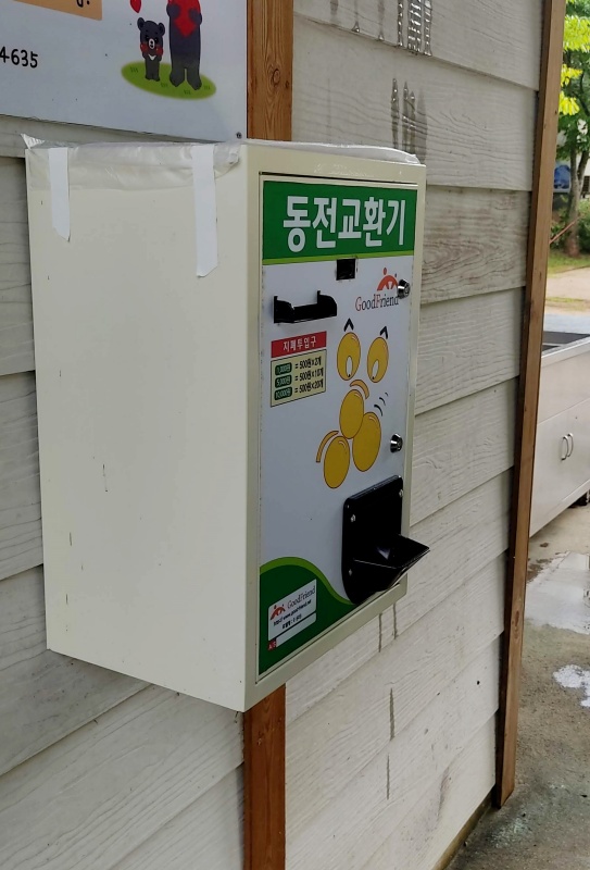 샤워장은 개수대 옆에 코인 샤워장이 있습니다. 개수가 적어 성수기 때는 전쟁일 듯싶습니다. 자리가 좁아 성인이 혼자 씻을 땐 괜찮을 것 같은데 아이들 씻기기가 좀 힘들어 보이네요. 500원 2개가 6분 이용 가능하고 앞쪽으로 동전교환기가 있습니다.