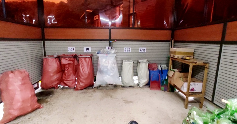 쓰레기 처리장은 재활용품은 따로 일반쓰레기는 쓰레기봉투를 구매하시면 되고요. 재 처리하는 곳에 소화기랑 모래가 비치되어있습니다.