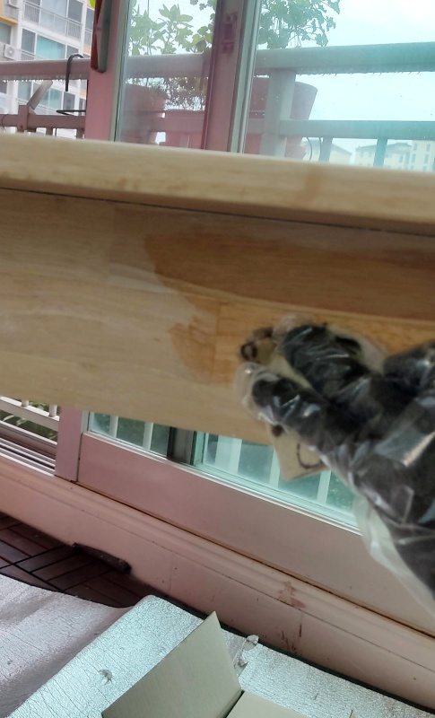 색이 약간 진해지고 나이테가 돋보입니다. 오일 스테인은 생각보다 나무 깊이 침투를 하는 편이에요. 혹시나 다른 색으로 바꾸고 싶을 때 생각보다 샌딩작업을 오래 해야 합니다. 진한 색을 옅은 색으로 리폼할 때보다 옅은 색을 진하게 리폼하는 것이 더 쉽죠. 그래서 진한 색 오일스테인은 한참 고민한 뒤 하는 편입니다.