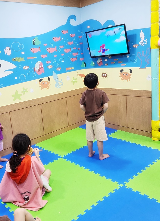 사실 이맘때 아이들은 찜질하러 찜질방에 가는 것이 아니지요. 쿠앙이 쿠웅이 최애장소는 놀이방. TV로 애니메이션이 나오고, 뒤쪽으로 놀이 시설이 있어요. 아이들의 안전을 위해 놀이 매트를 모두 깔아놓았습니다. 사람 많은 곳에서 잠시 한눈을 팔면 쿠웅이가 사라졌는데 찾다 보면 놀이방에서 TV를 보고 있더군요.