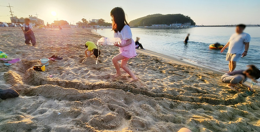모래놀이를 하다 보니 석양이 지네요. 이렇게 물에 쫄딱 젖은 채로 모래에 파묻었는데 샤워를 안 할 수 없습니다. 샤워실이 저녁 8시(성수기시즌)까지 이기 때문에 안 간다는 아이들을 달래서 사이트로 돌아옵니다.
