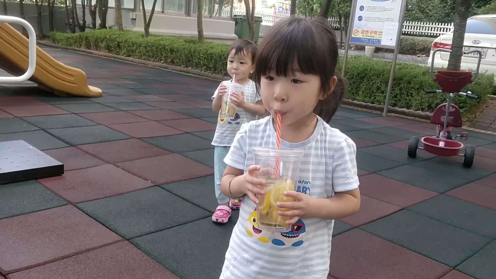 놀이터에서 신나게 놀며 레모네이드를 먹고 있어요.