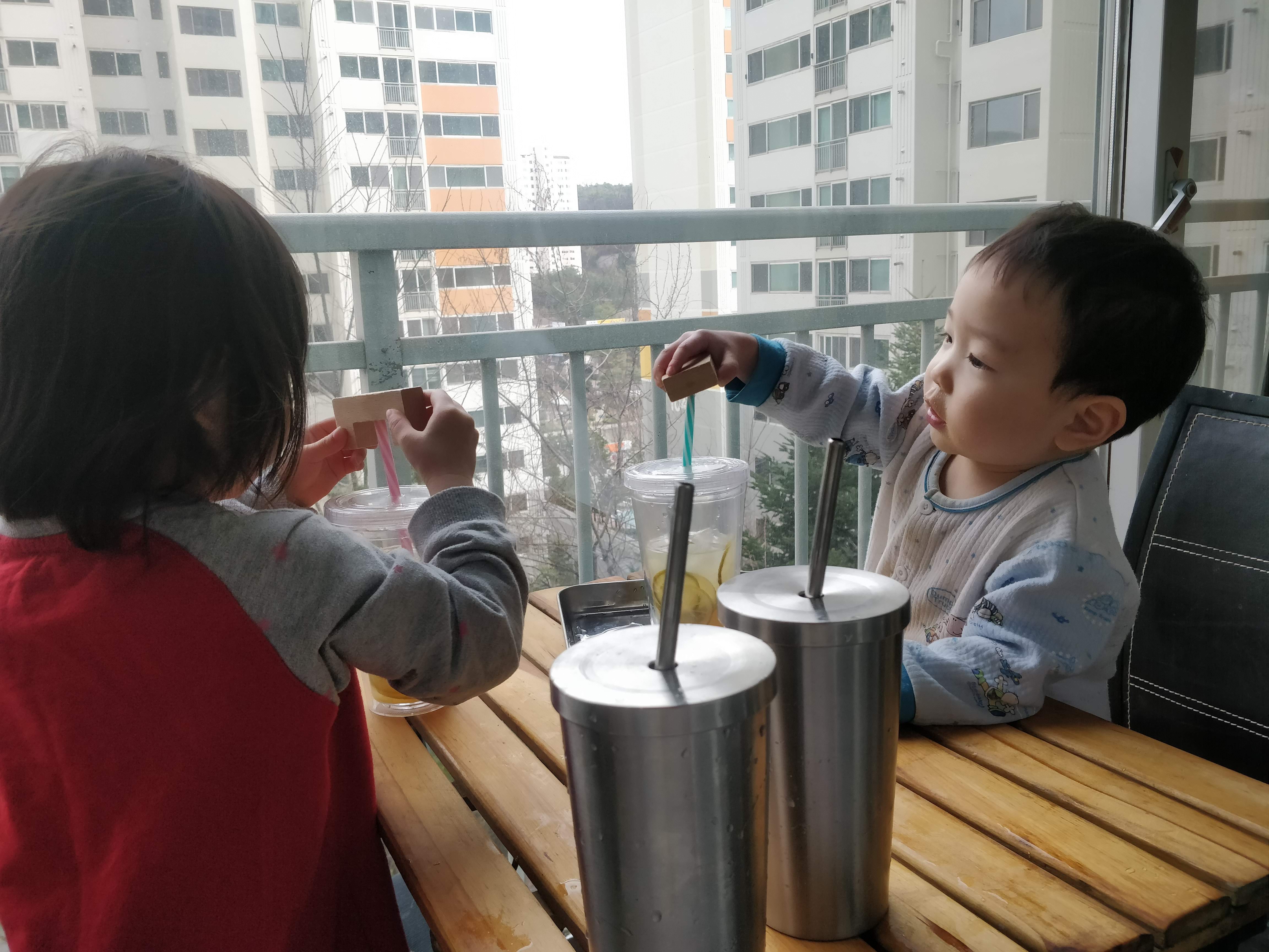 엄마 아빠는 커피 아이들은 레모네이드를 타서 카페 놀이를 즐기기도 하고