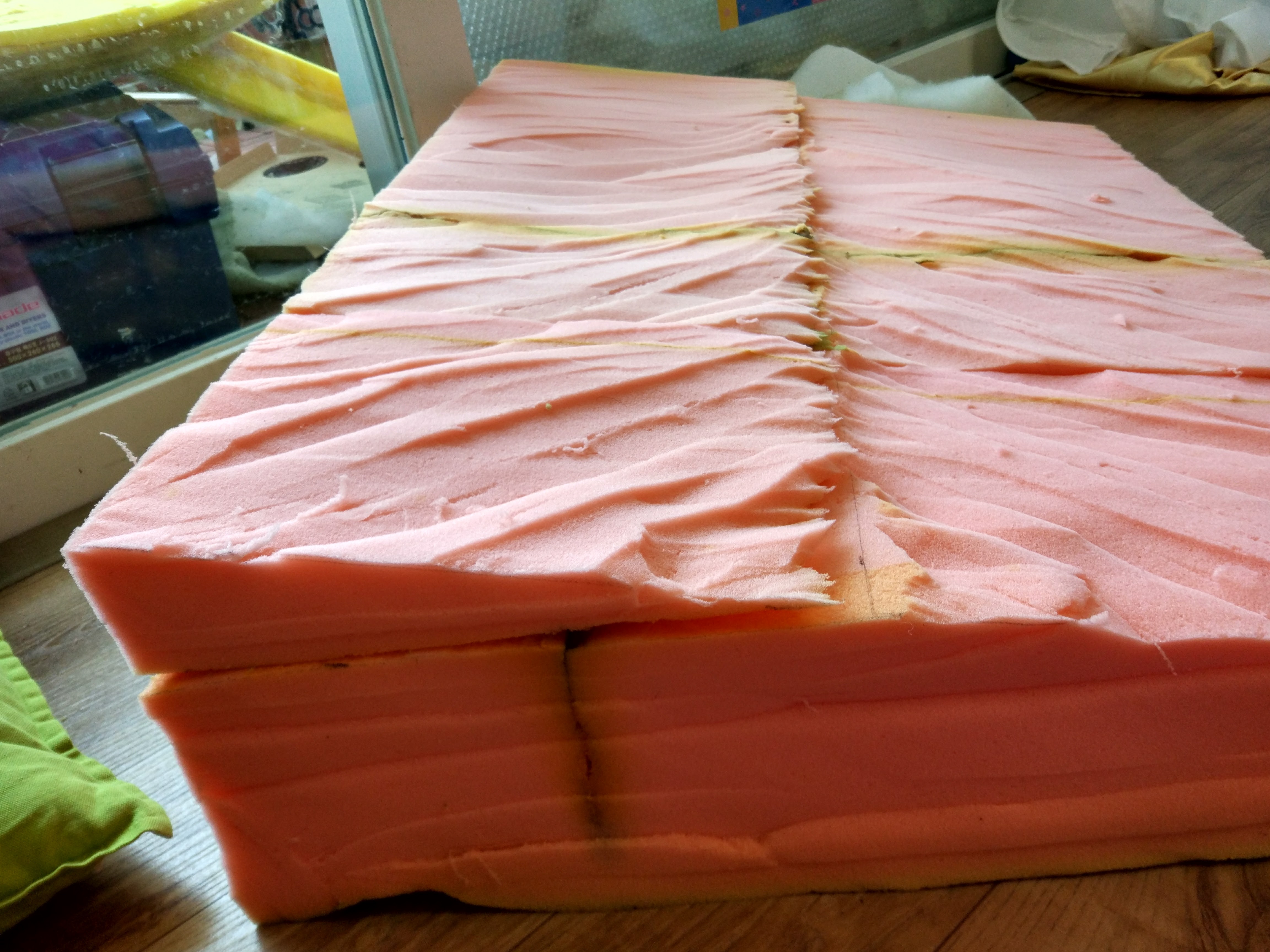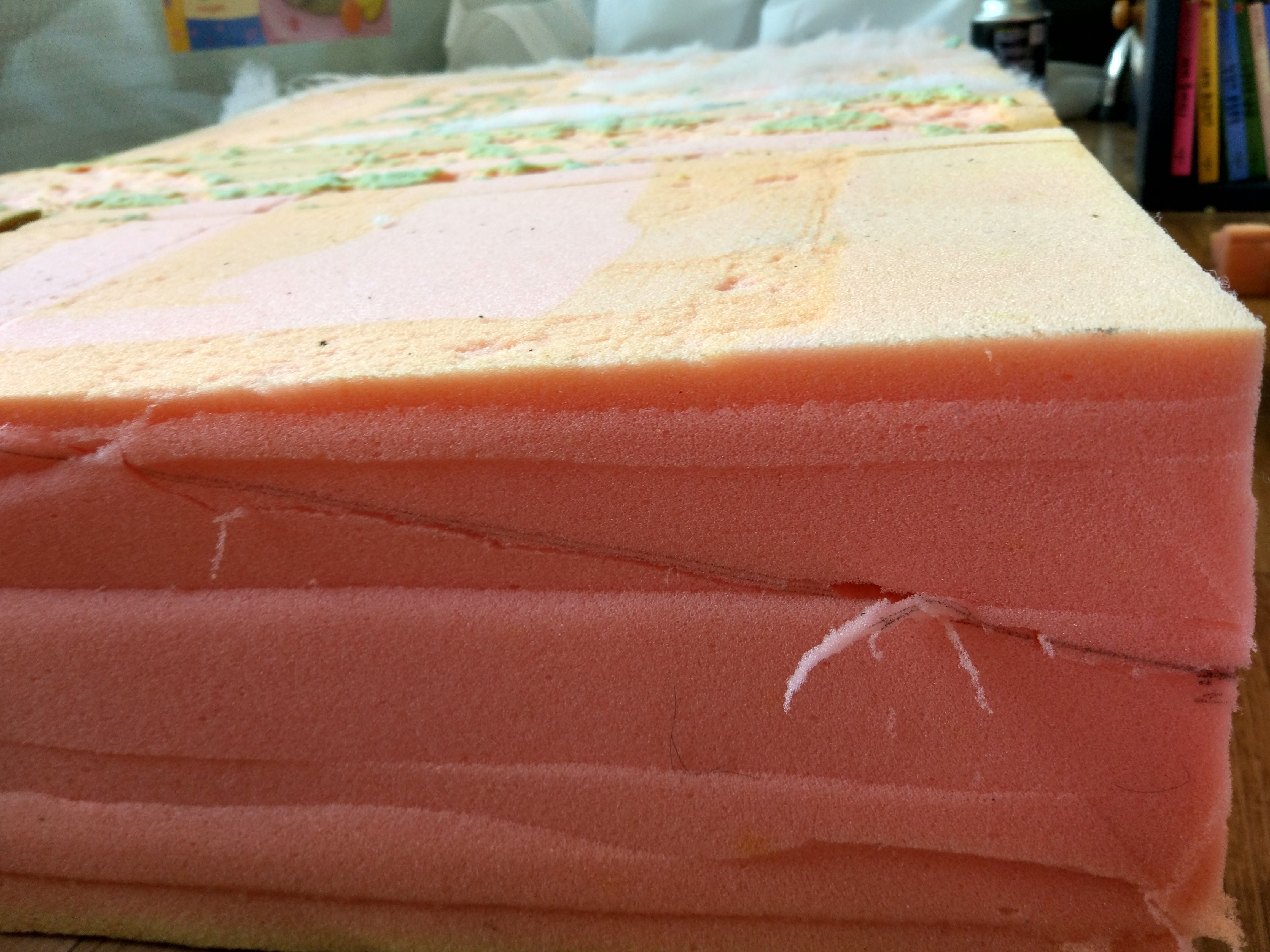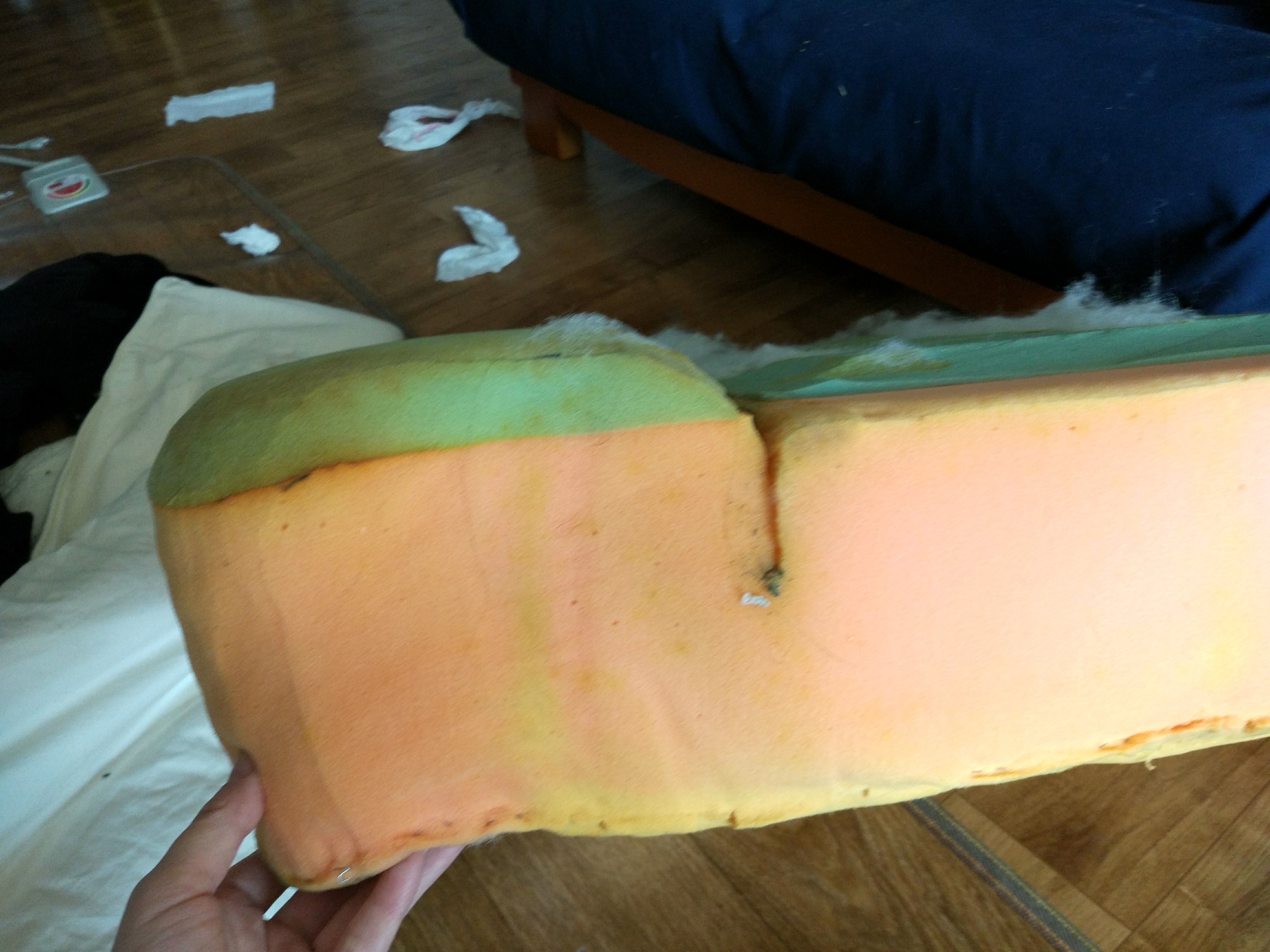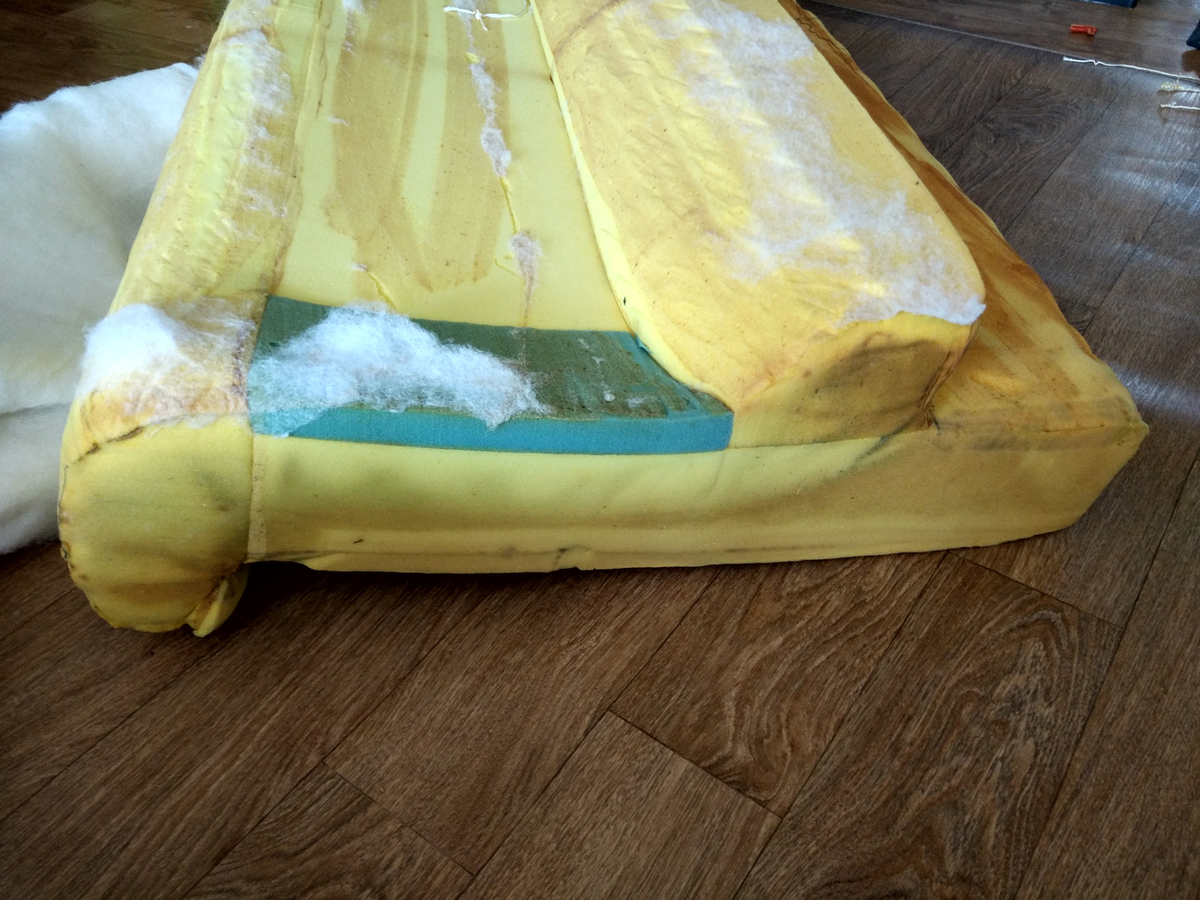 솜은 너무 지저분해서 다 뜯어주었습니다. 하나의 스펀지가 아니라 이렇게 스펀지 위에 다른 스펀지를 붙여주었네요.
