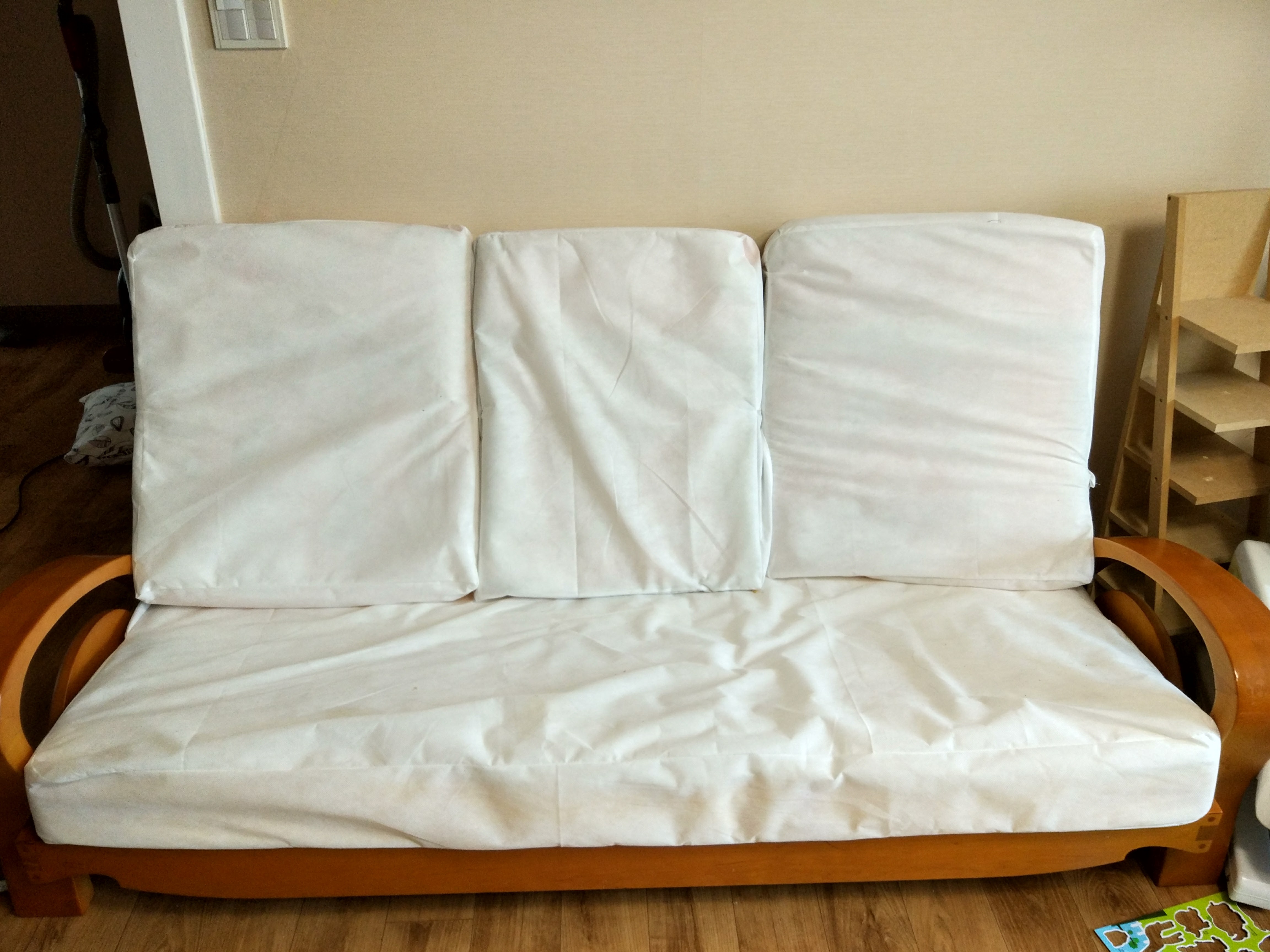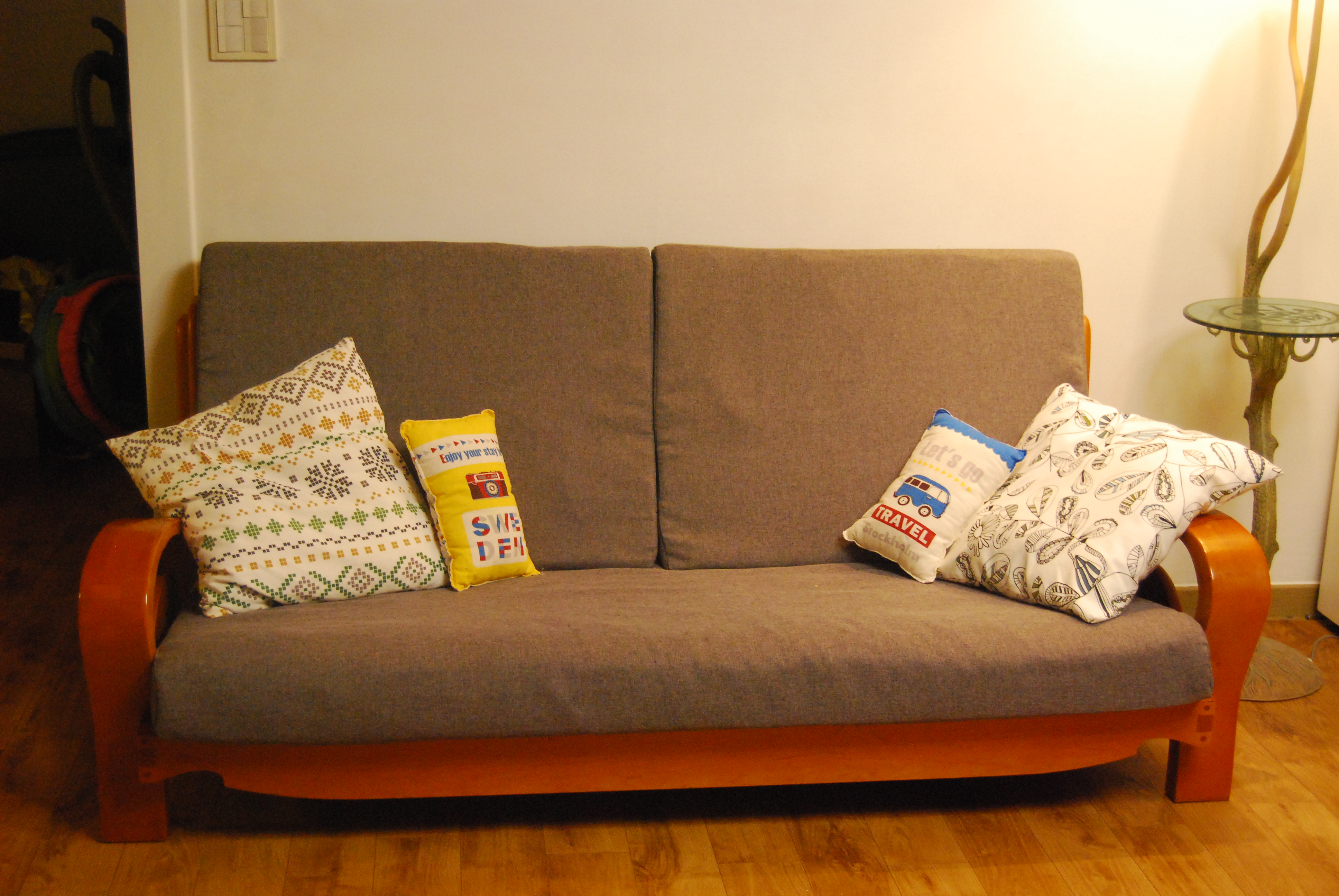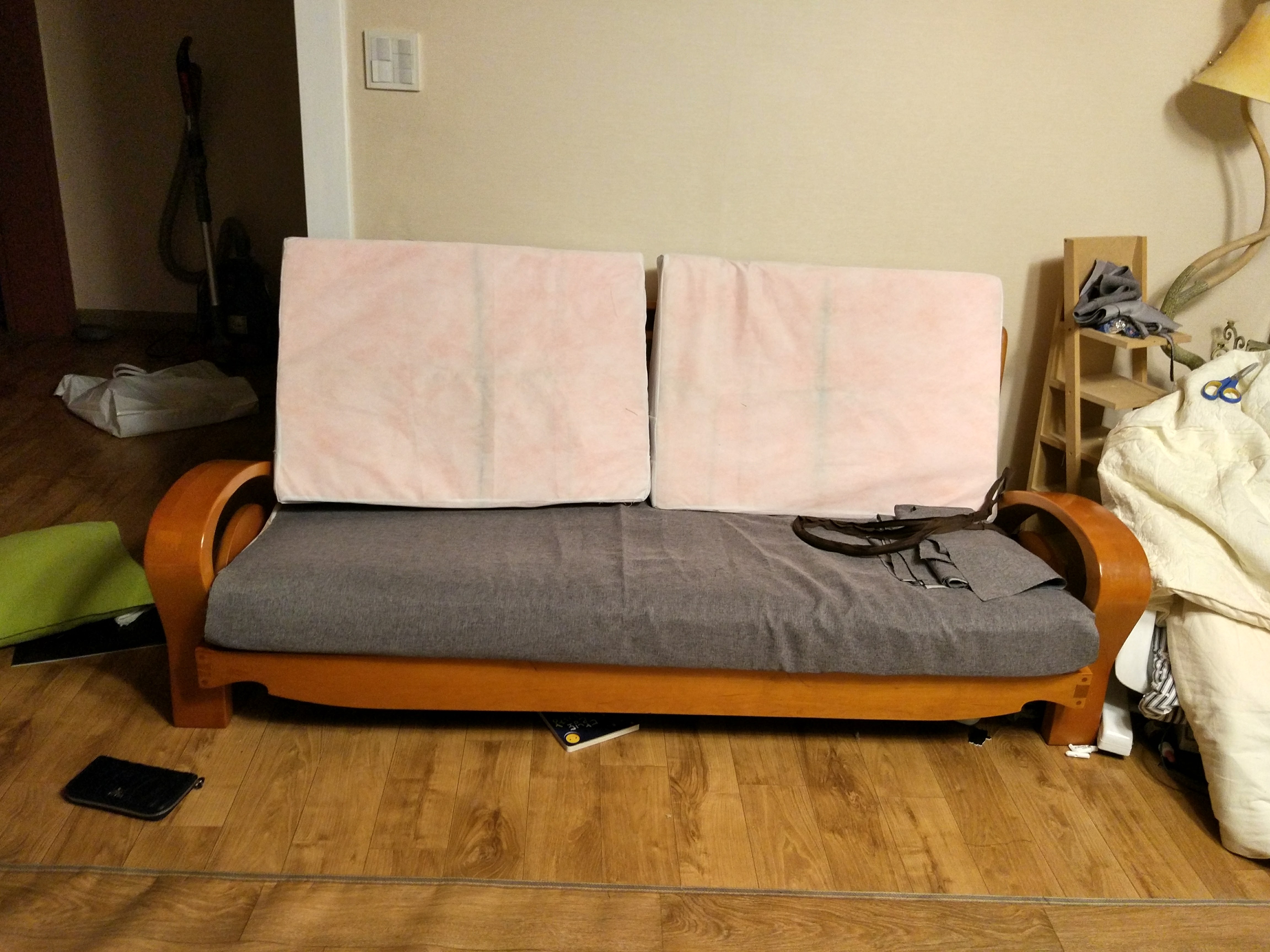 3조각이었던 소파 쿠션 중 하나를 반으로 잘라 연결해 2개의 긴 쿠션으로 만들고