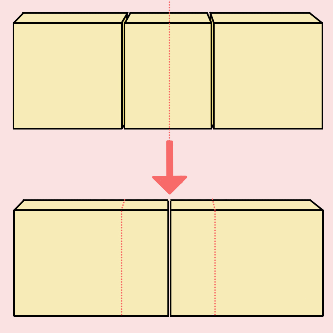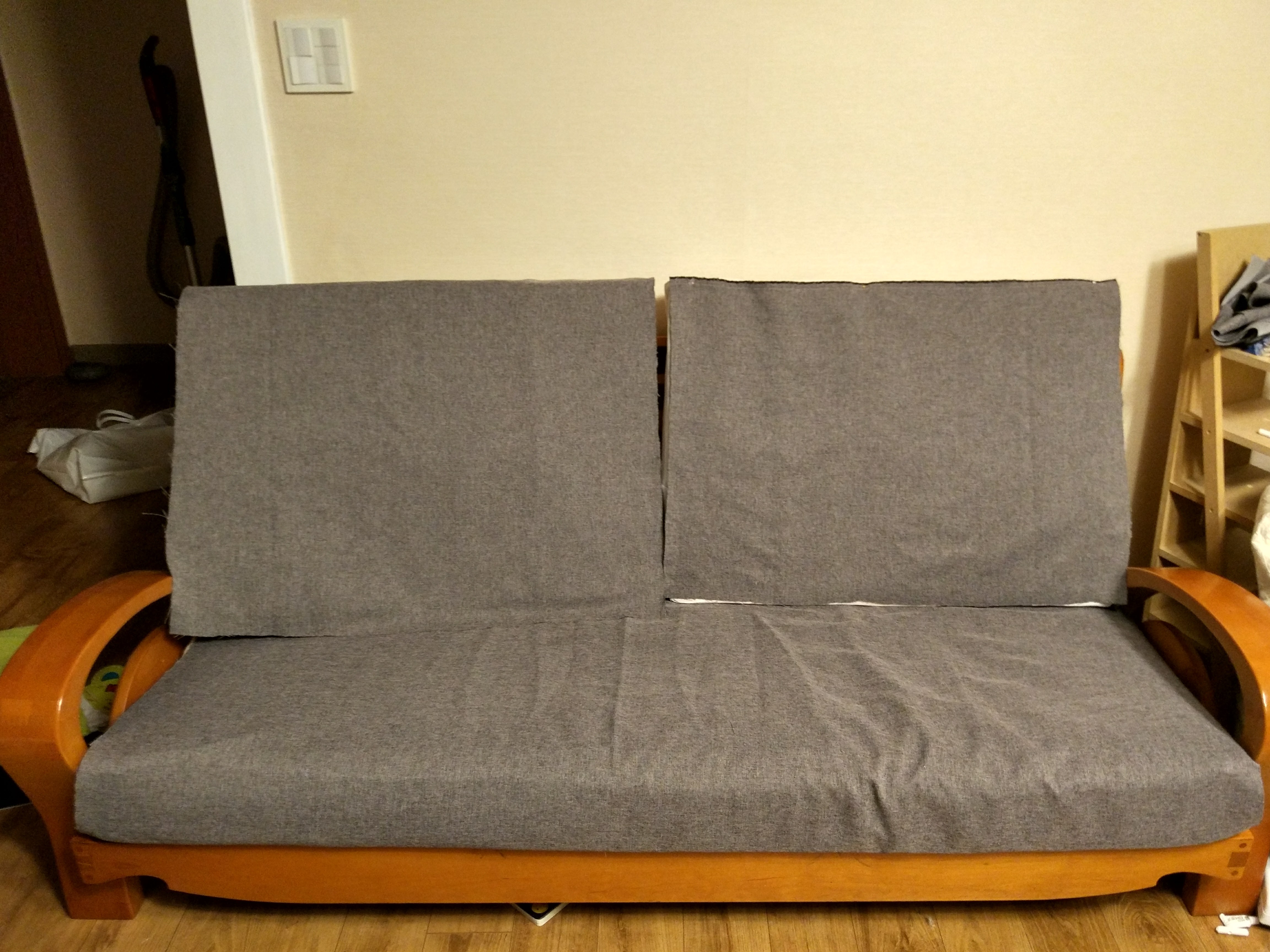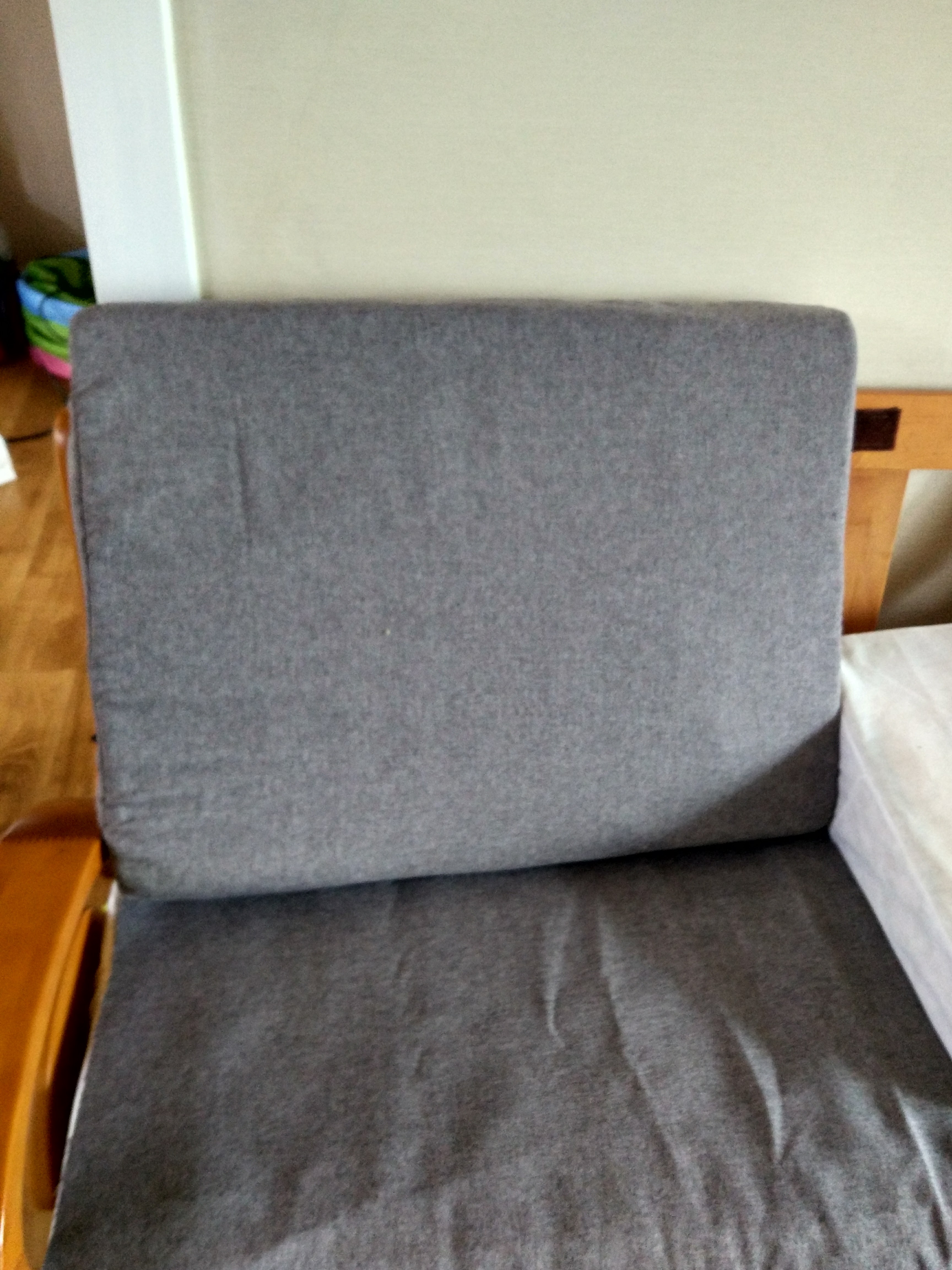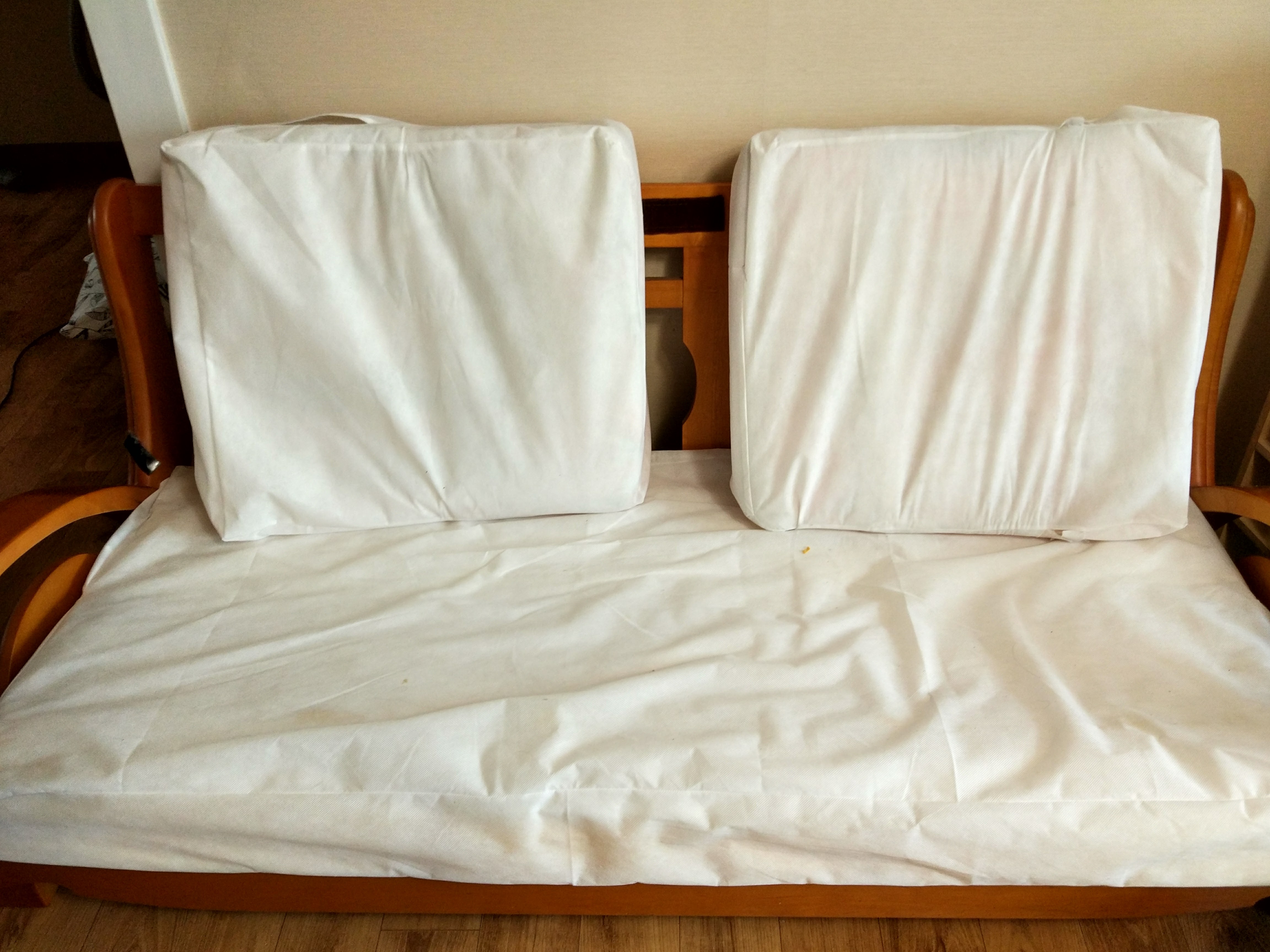 3조각이었던 소파 쿠션 중 하나를 반으로 잘라 연결해 2개의 긴 쿠션으로 만들고