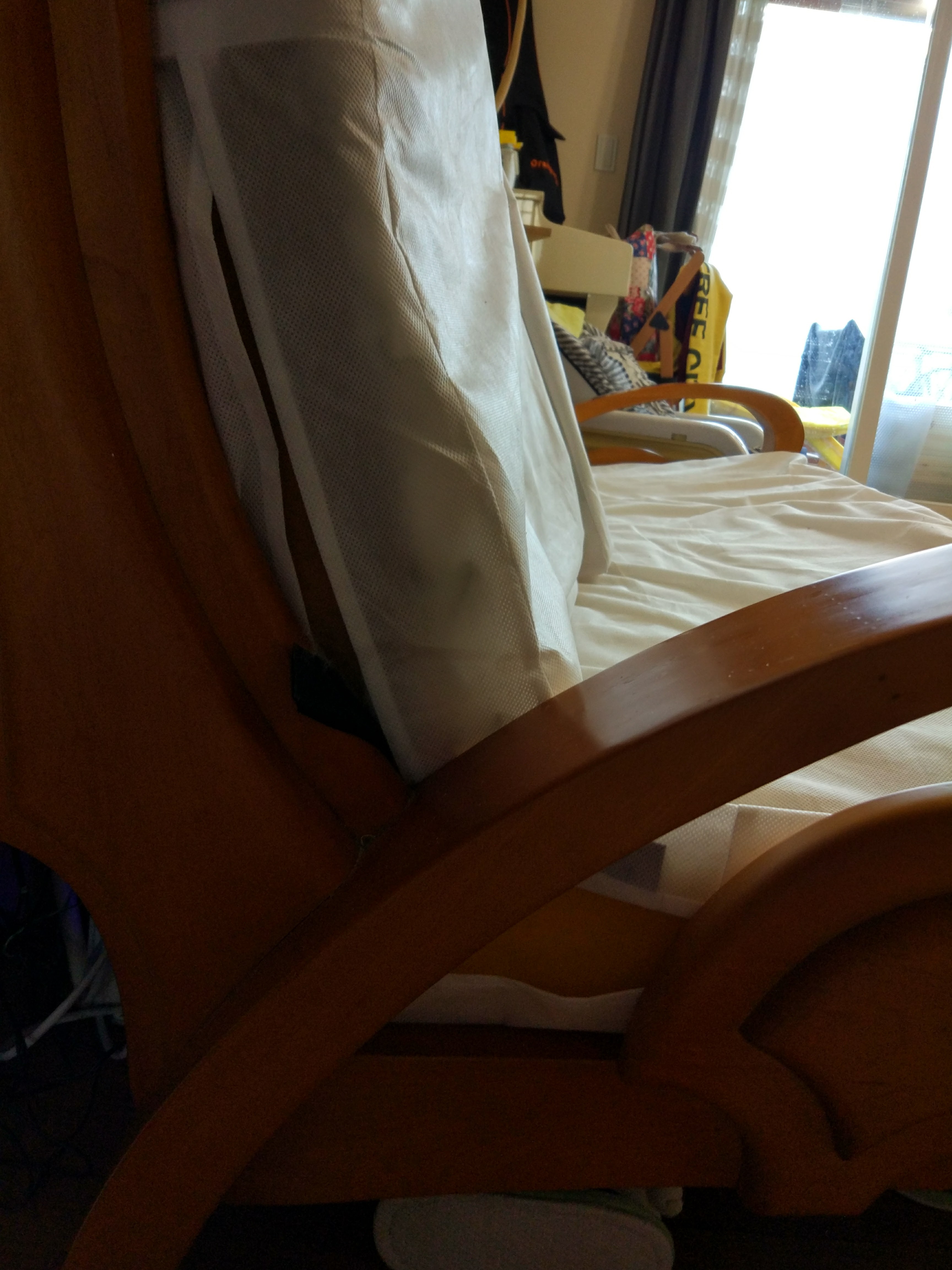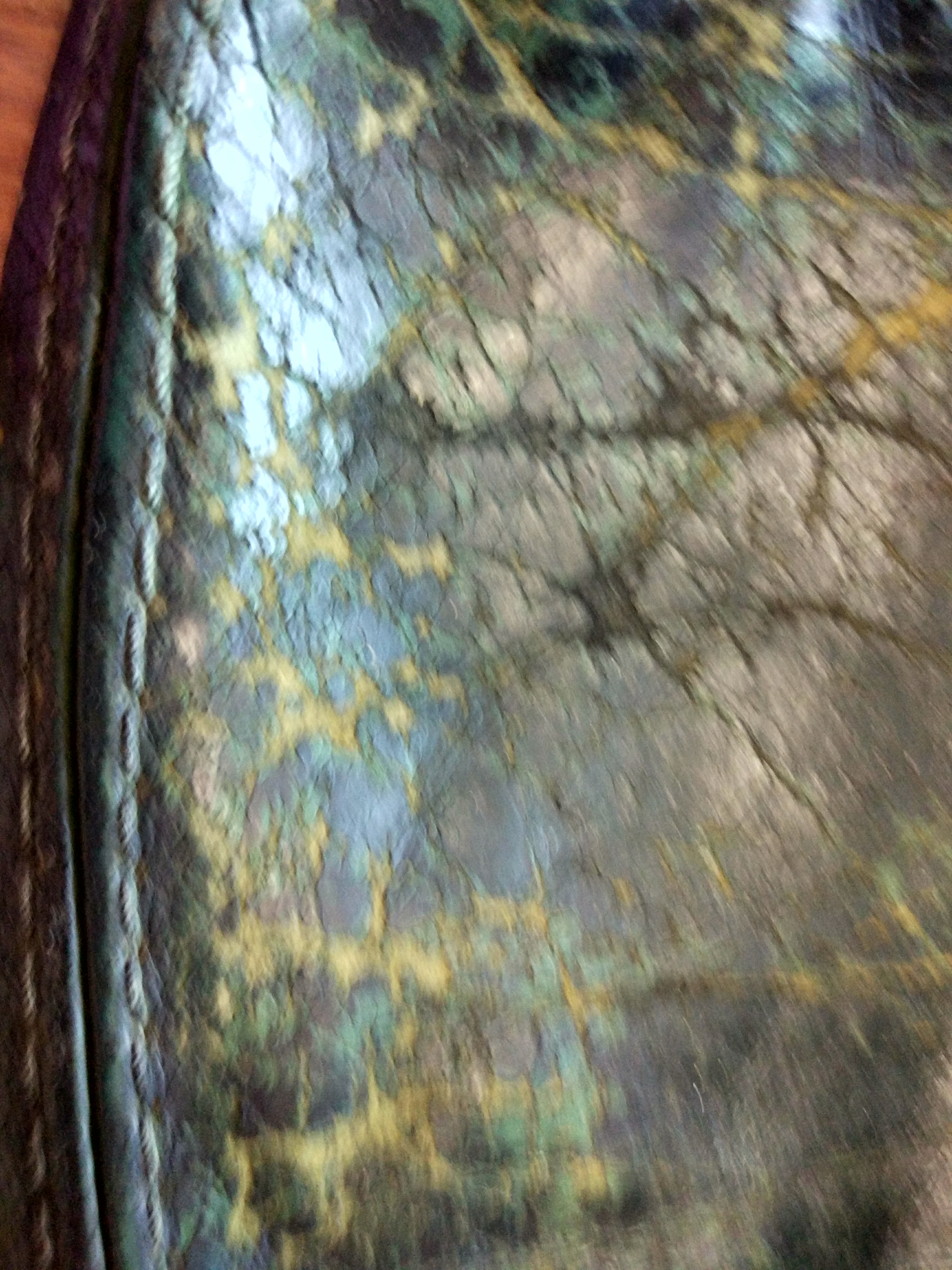 굴곡이 있어 허리를 편하게 해 주고 솜으로 폭신함을 더한 것 같습니다. 가죽이 낡아 부서진 흔적이 가득하네요.