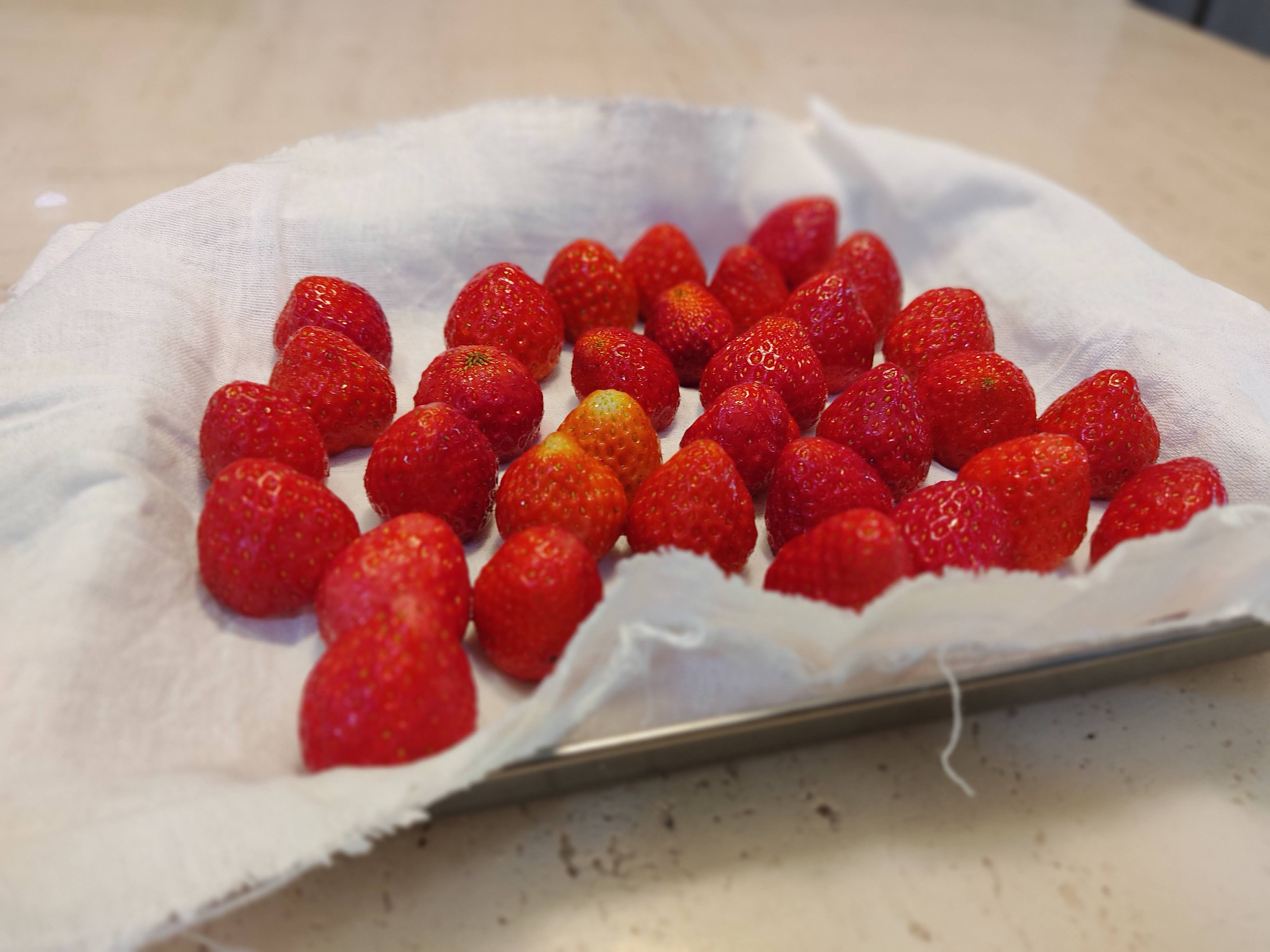 이렇게 물기가 없어진 딸기를 썰어서 설탕과 숙성시켜주면 돼요