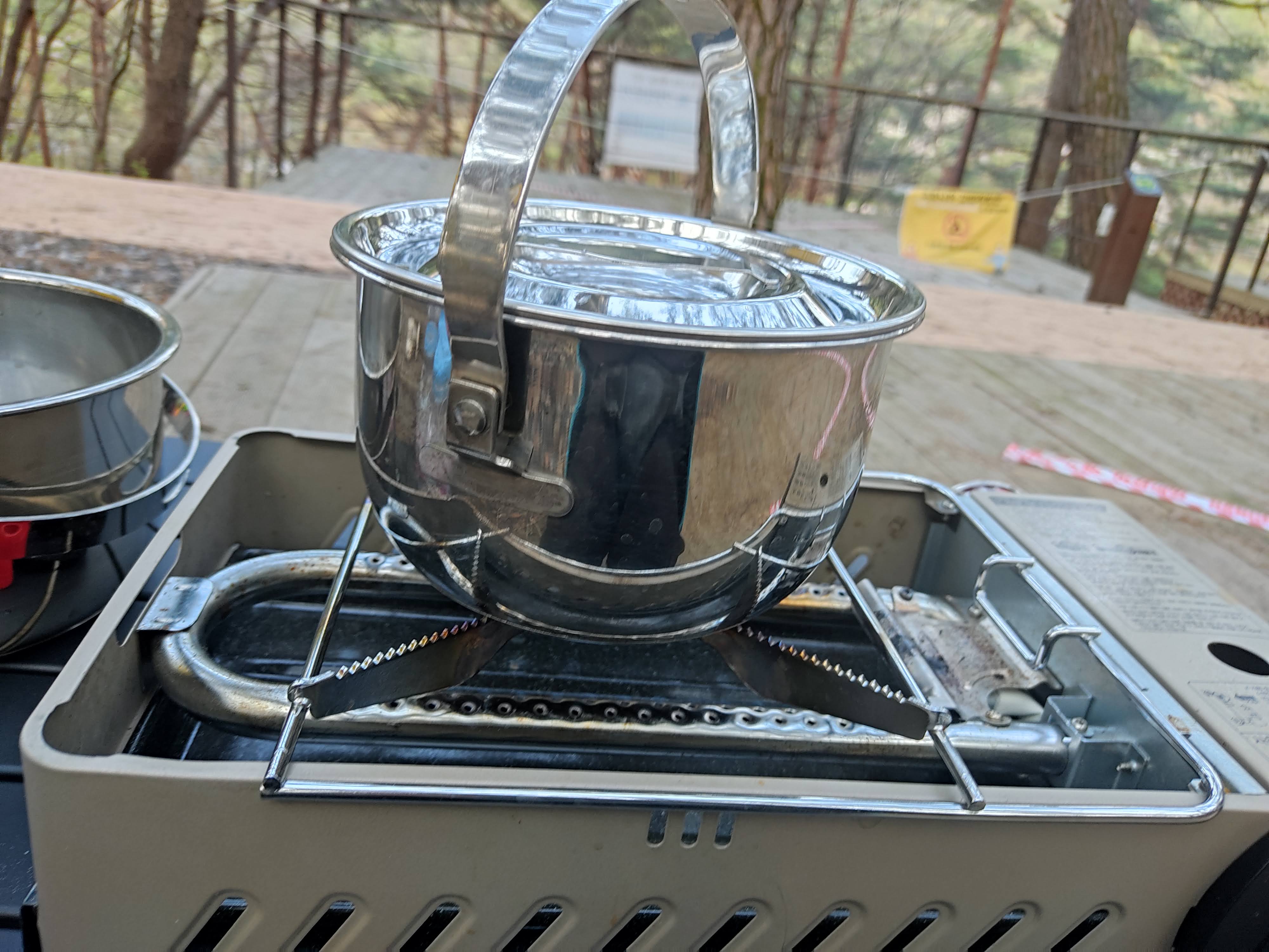 이런 손잡이가 달린 코펠이라면 손잡이를 위로 해주셔야해요! 낮은 불 이어도 손 데여요~