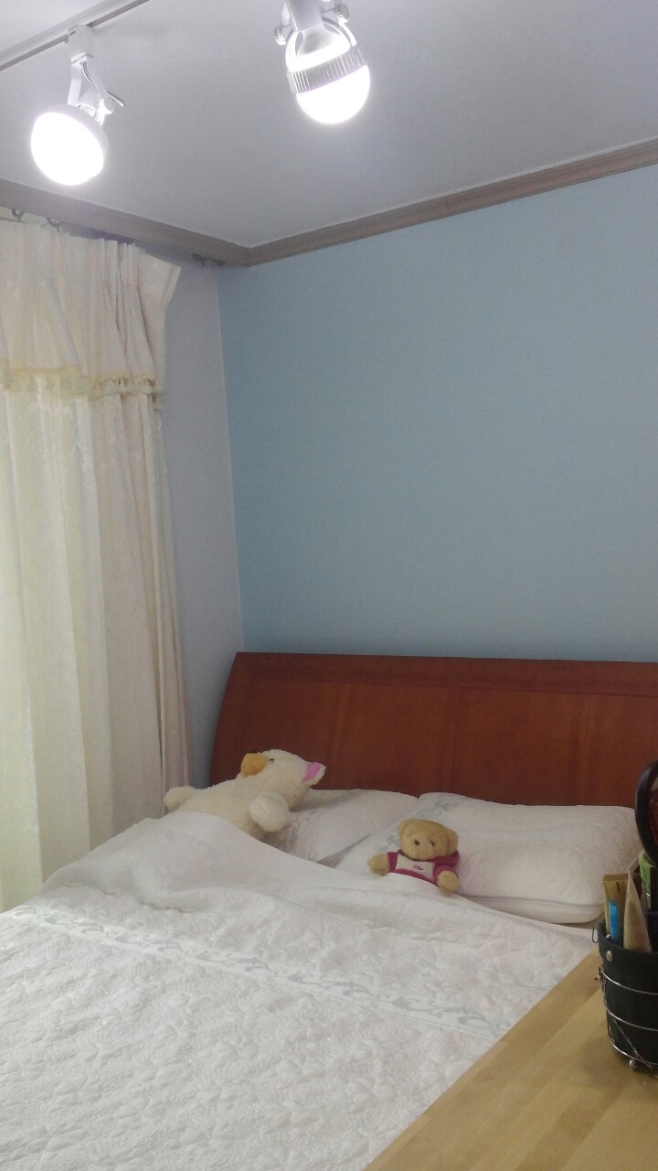 한쪽 벽은 하늘색을 조색하여 칠해주고 나머지 벽은 옅은 파란색을 띠는 하얀색을 칠해주었어요.