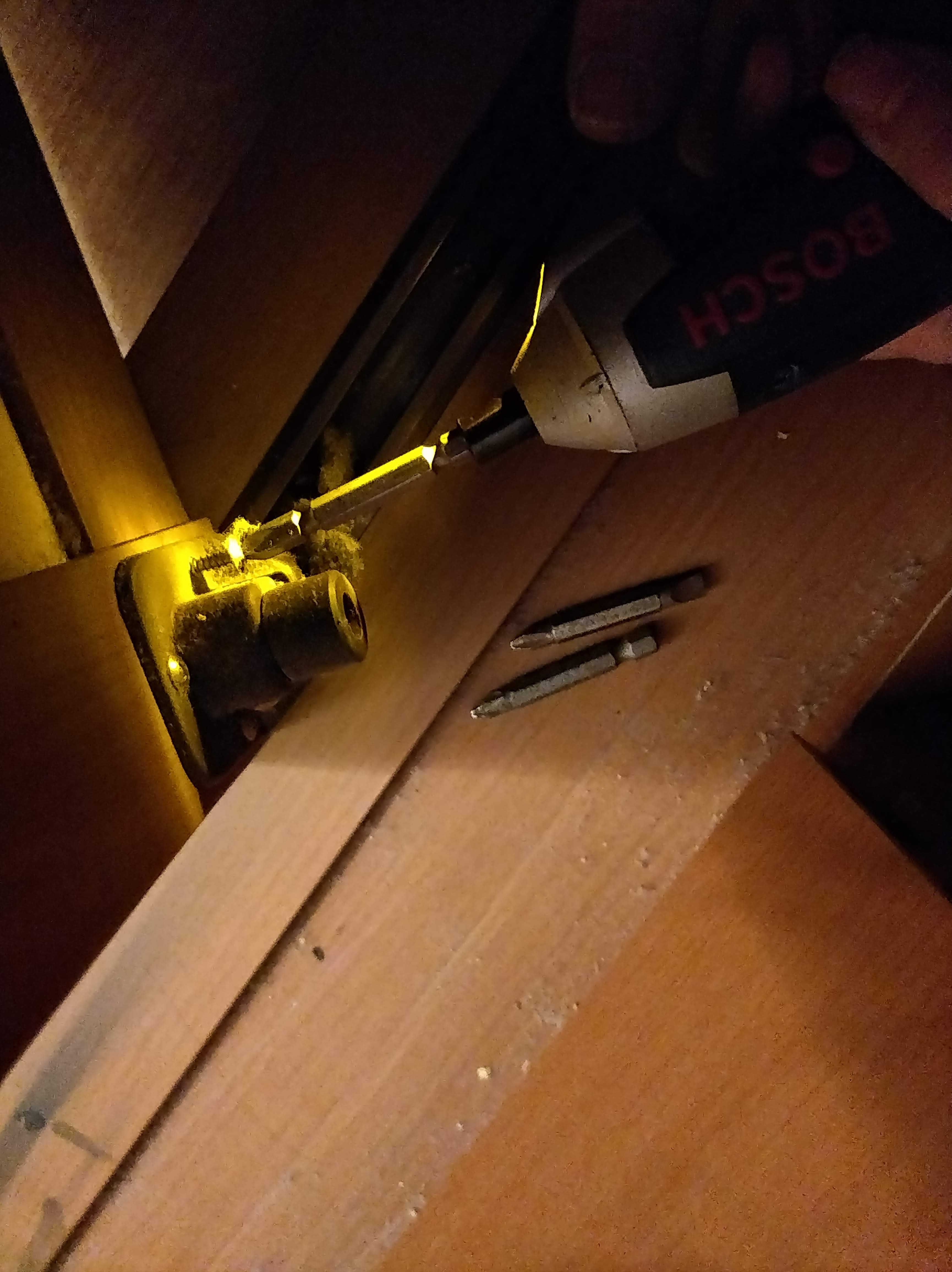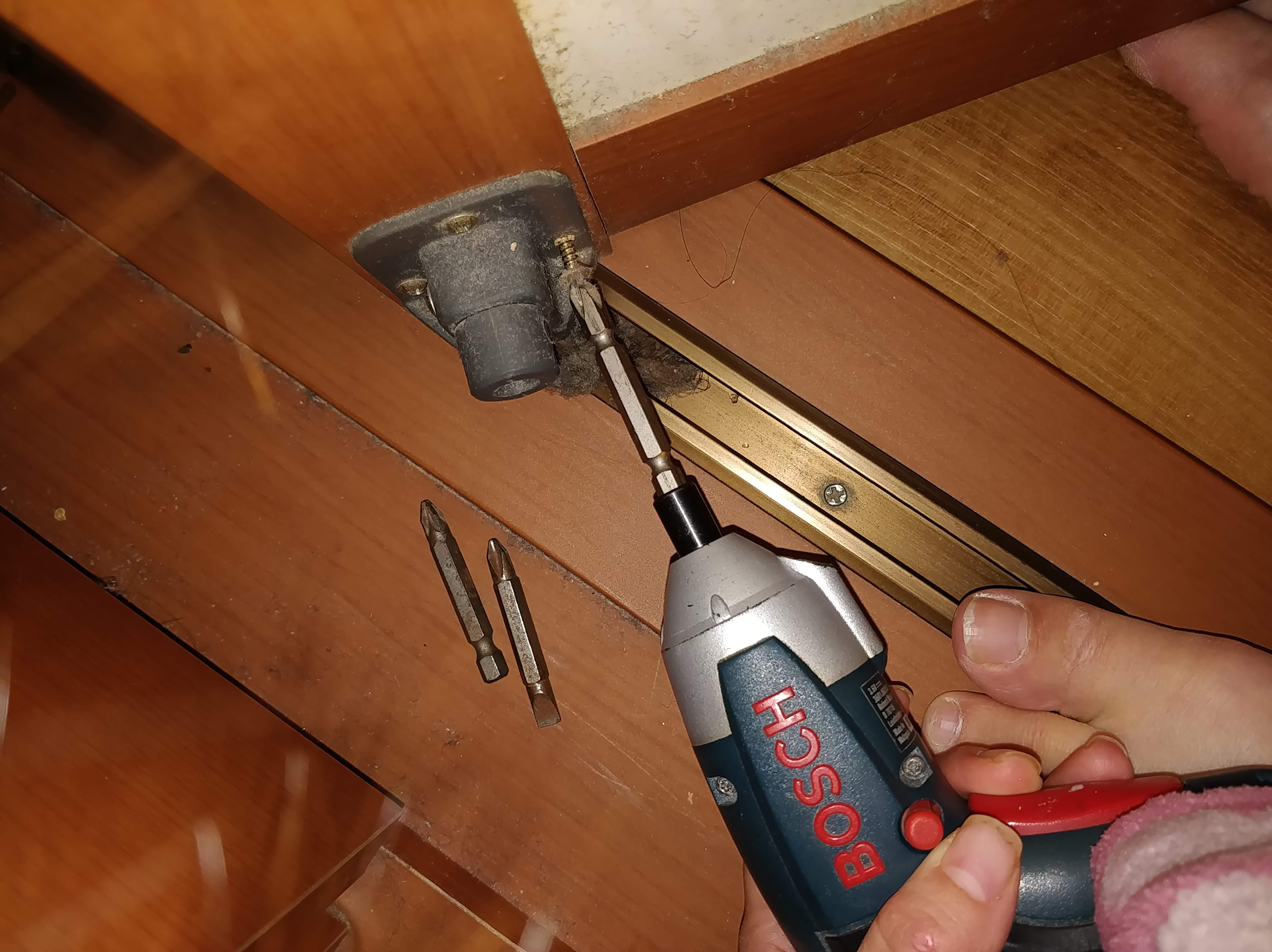 붙박이장 문 철거는 간단해요. 안쪽 옷을 빼고 그 안으로 쏙 들어가서 이렇게 생긴 부속에서 나사를 빼면 돼요. 어둠 속에서 나사 뽑기! 안 보이는 곳이라 먼지가 이렇게 쌓였는지 몰랐네요.