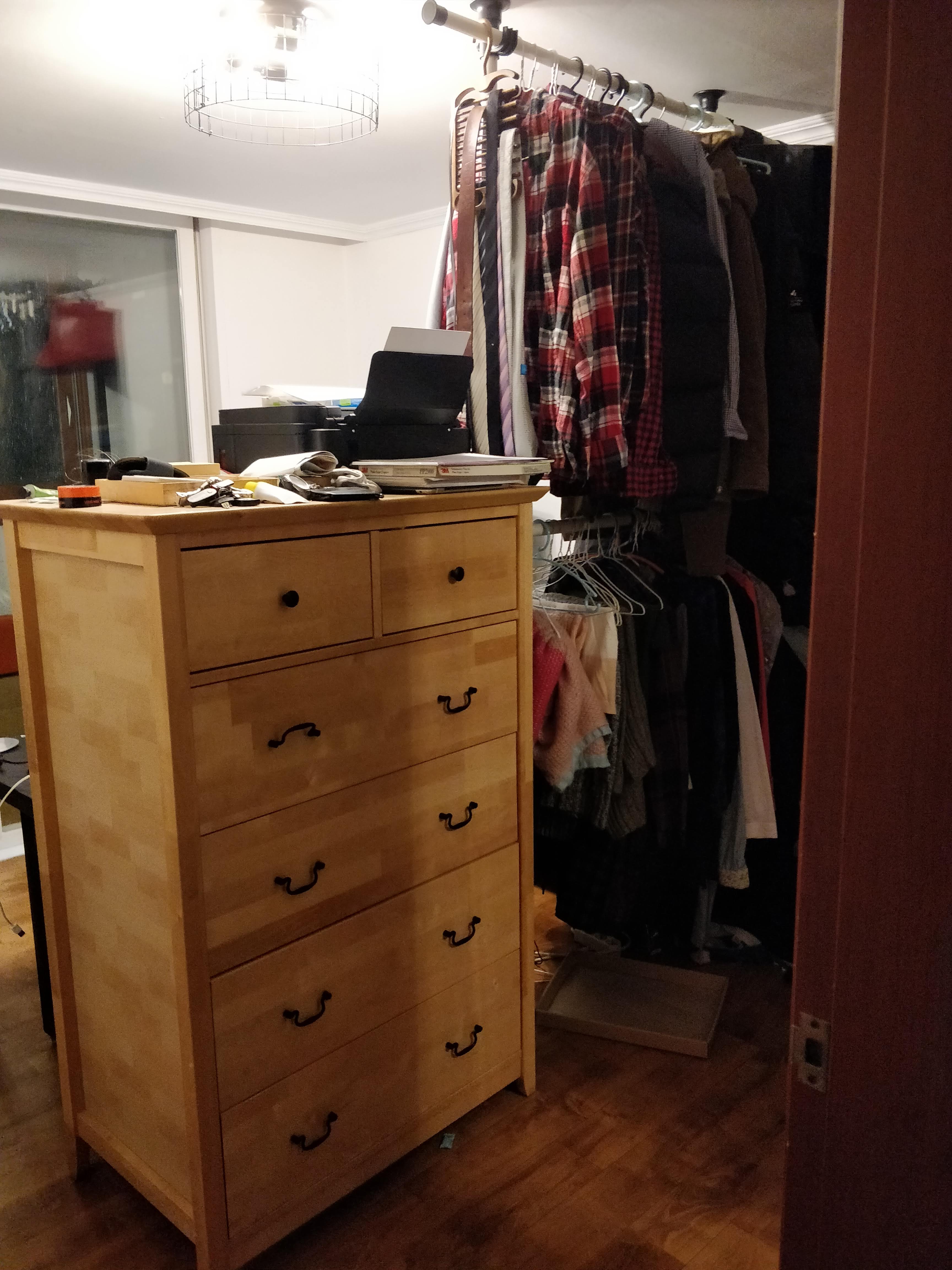 붙박이장과 평행하게 서랍장을 두어 침실과 옷장 구간을 분리하였습니다. 갖고 있었던 우드락으로 액자를 만들어 핀셋으로 붙이기도 했습니다. 나쁘지 않죠?? 근데 문제가 있습니다...