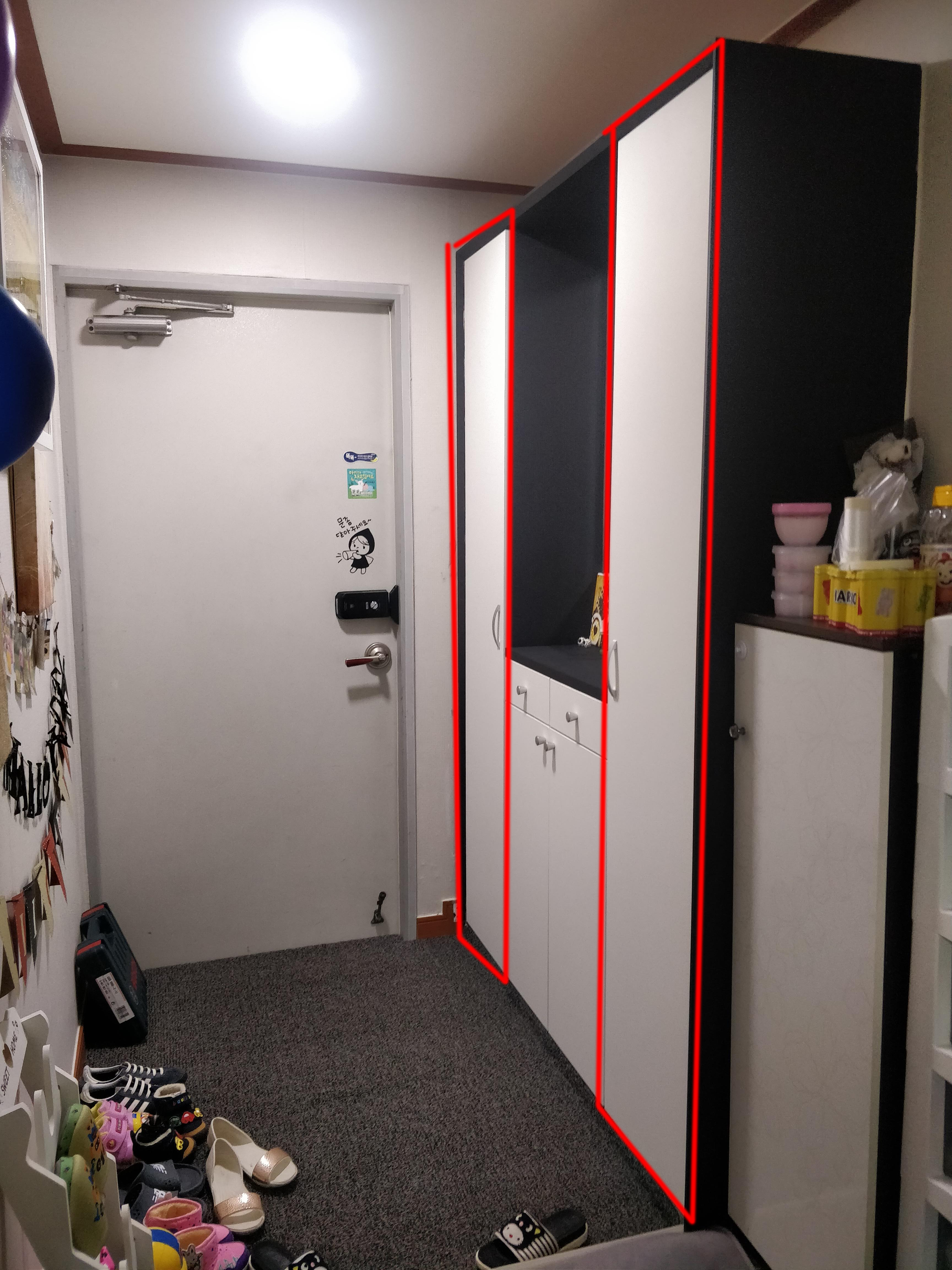 신발장 윗부분을 저렇게 난잡하게 올리지 않게 신발장 아래쪽을 올려 신발을 정리하는 구간을 만들자는 계획입니다.