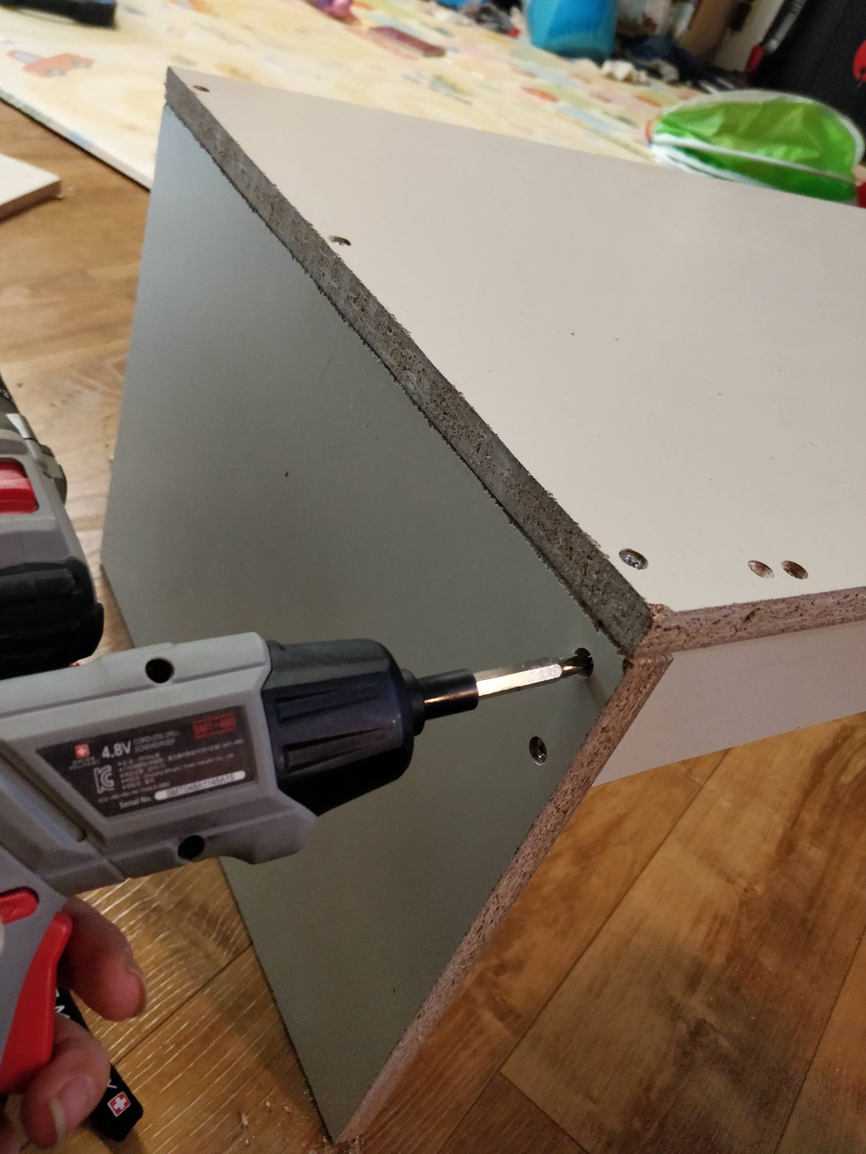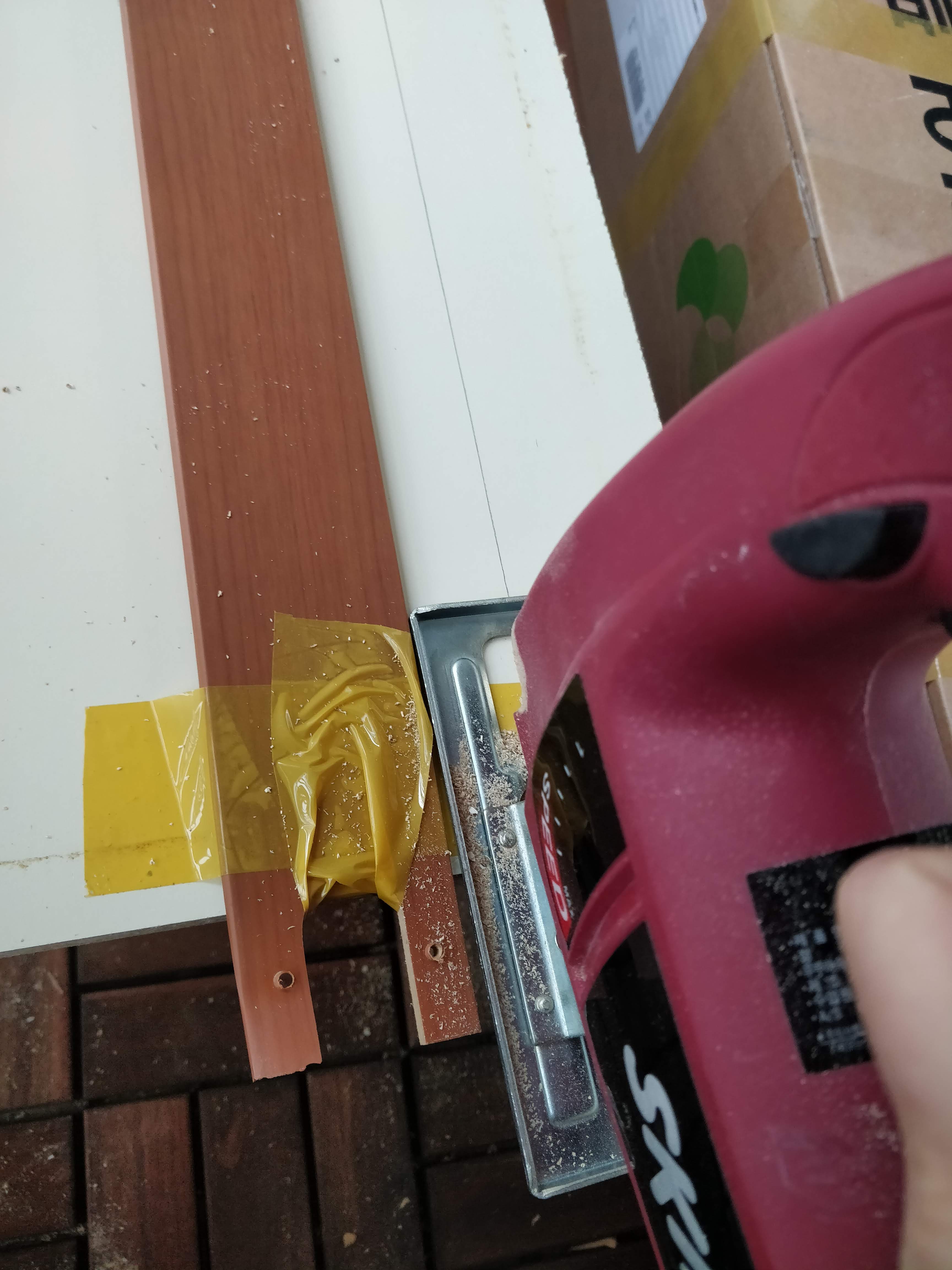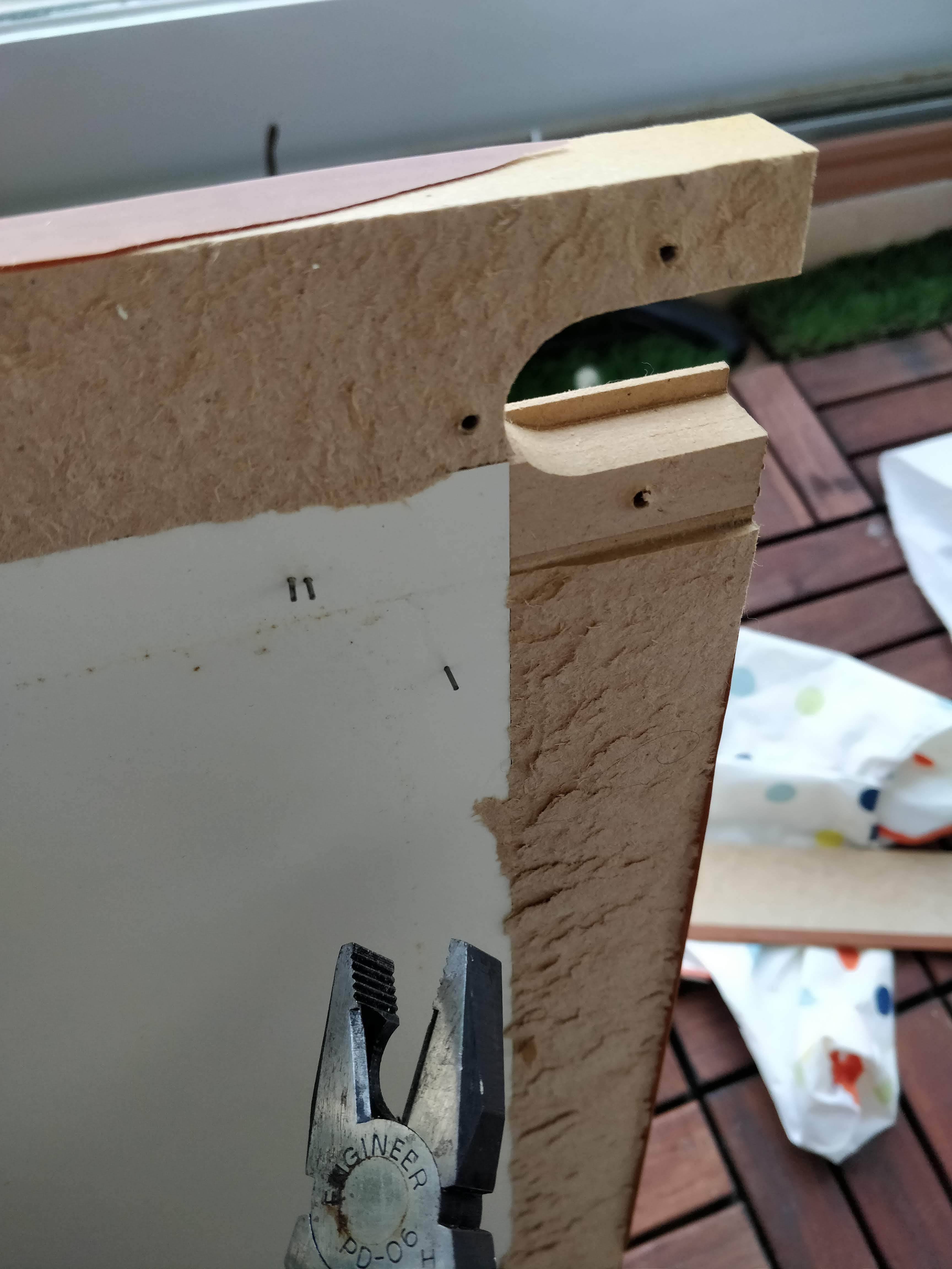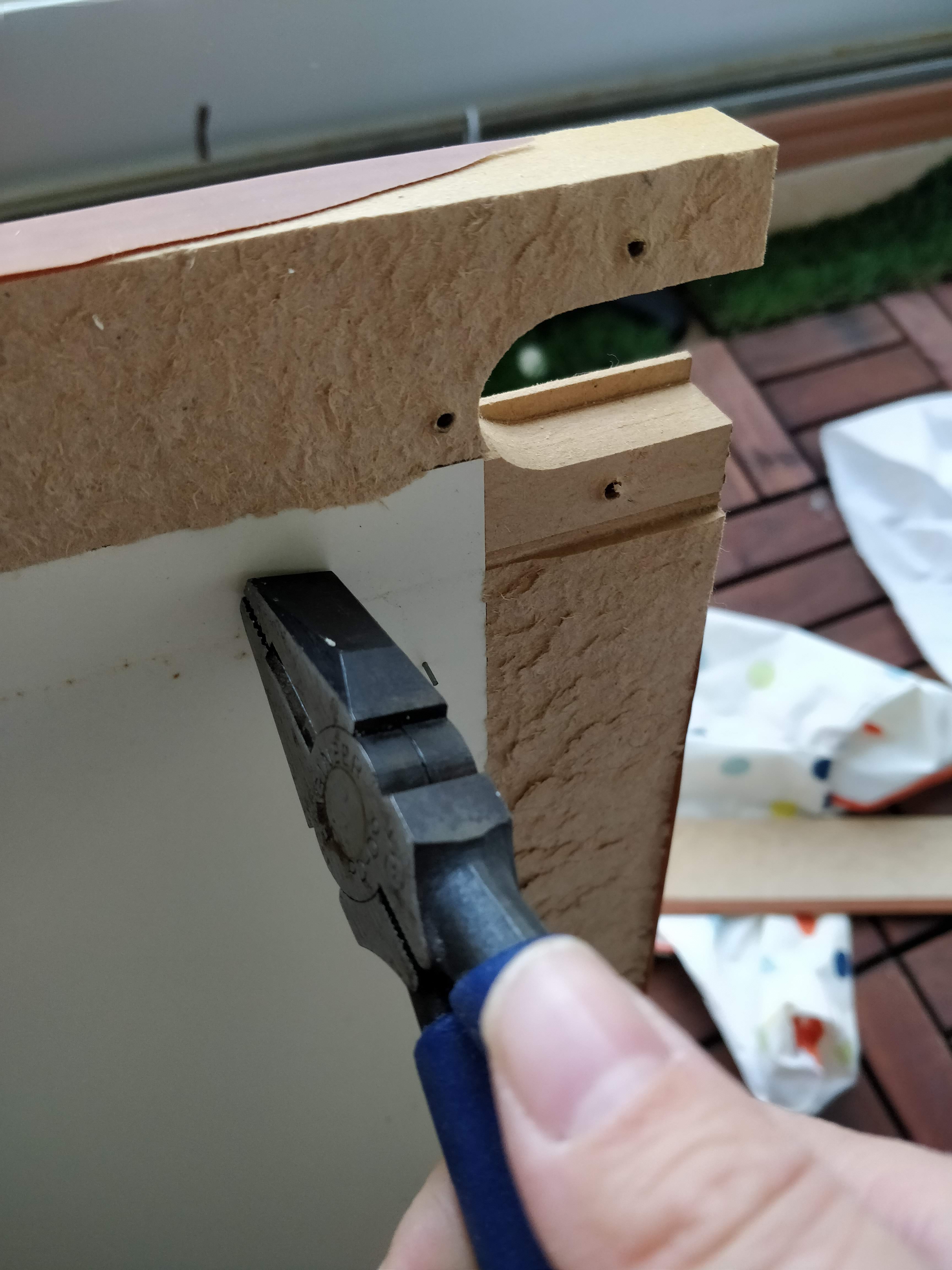 위쪽에 합판과 함께 붙여줍니다. 원래 하나의 가구였던 것처럼 보이게 하는 마술입니다!