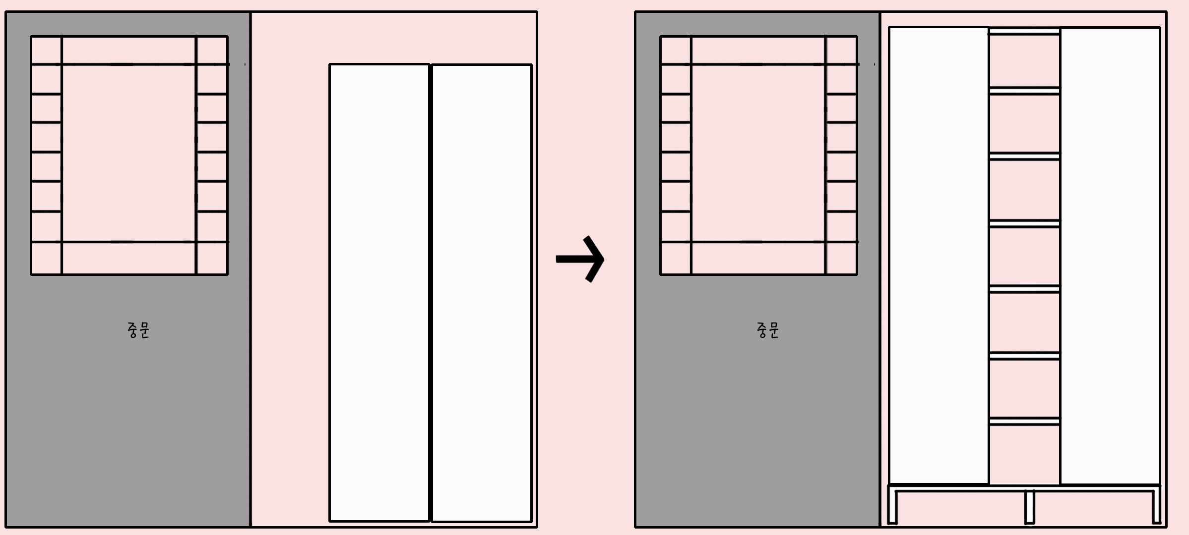 신발을 벗는 공간을 메워 복도로 만드시고 철문을 철거하고 중문으로 만드셨어요.