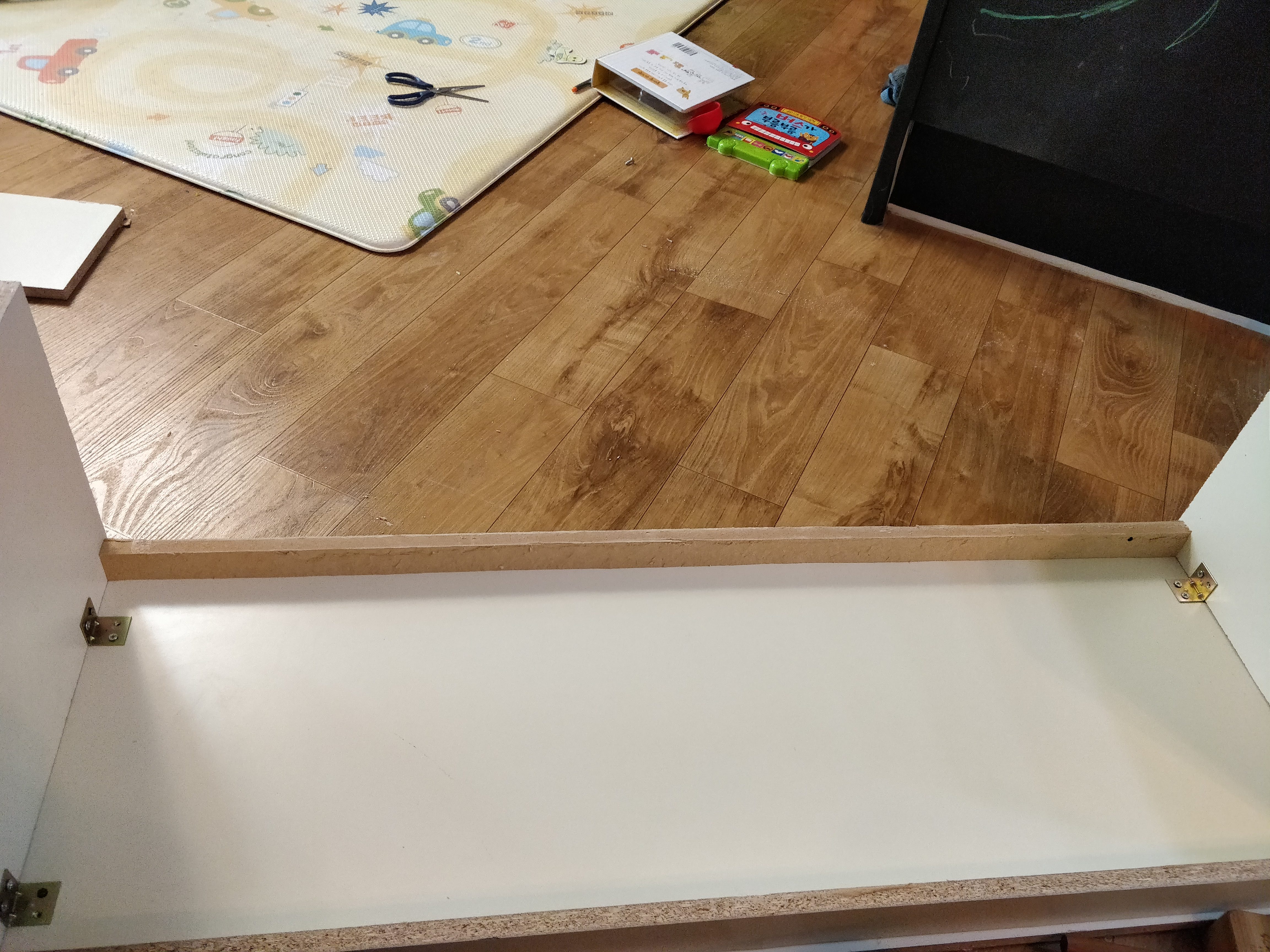 높이에 맞춰 집에 있는 목재를 연결하고 (붙박이장의 ㄷ자 장식 활용)