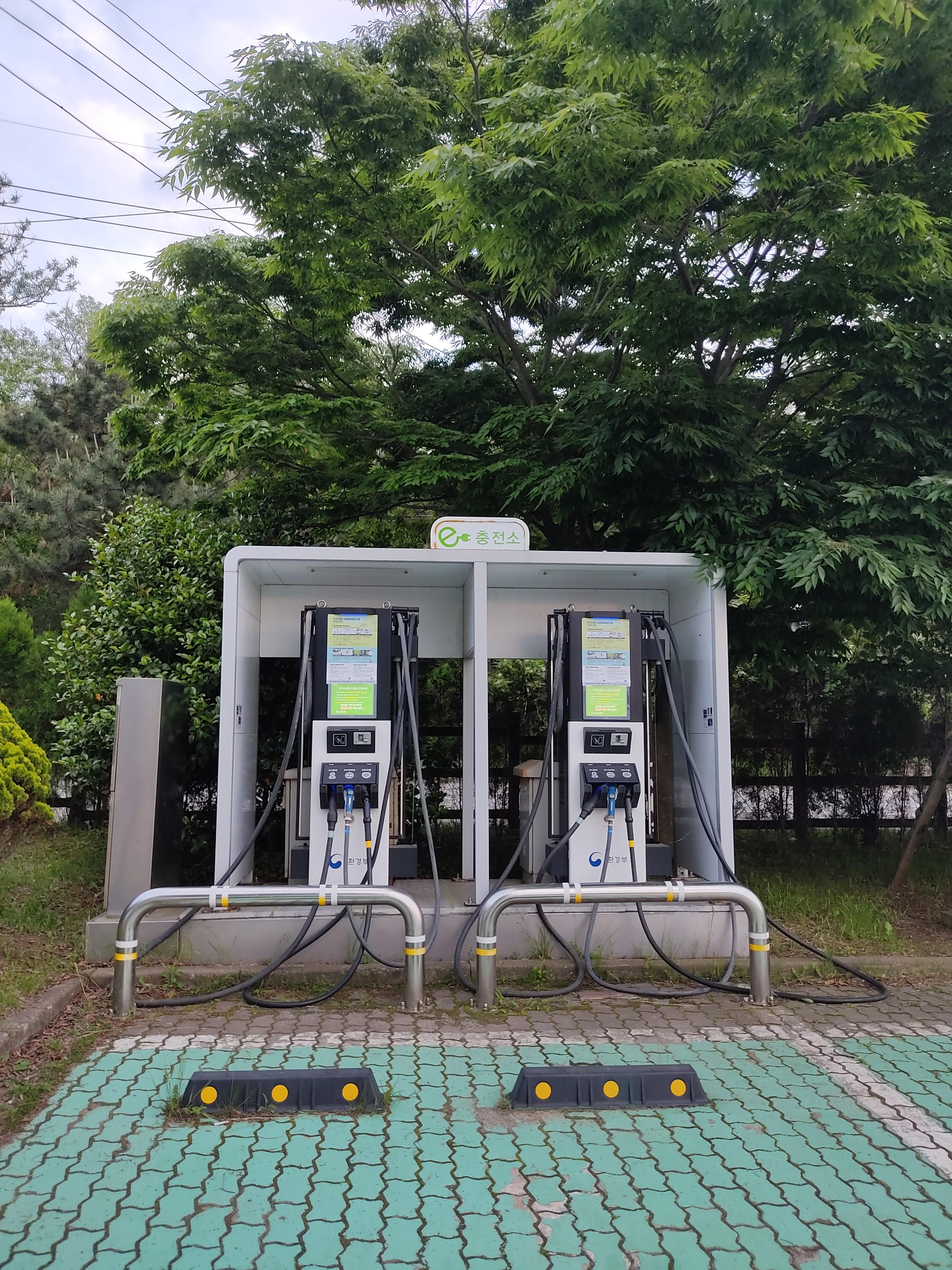 주차장엔 2개의 전기차 충전소가 있어요. (DC콤보, DC차데모, AC3상)