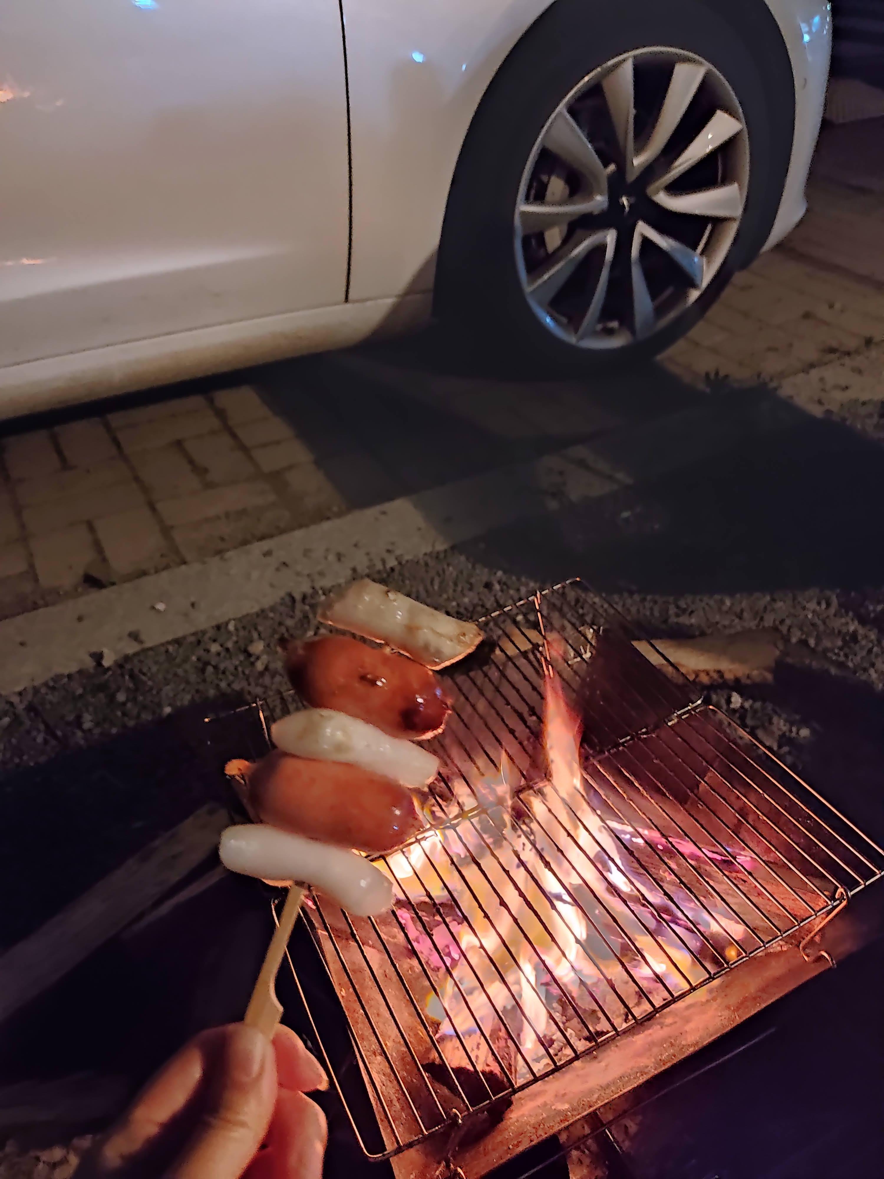 아이들을 위해 소떡소떡도 구워봅니다! 어느새 해가 완전히 져서 어둡네요. 바닷가 쪽에서 "펑!! 펑!!" 소리가 들립니다