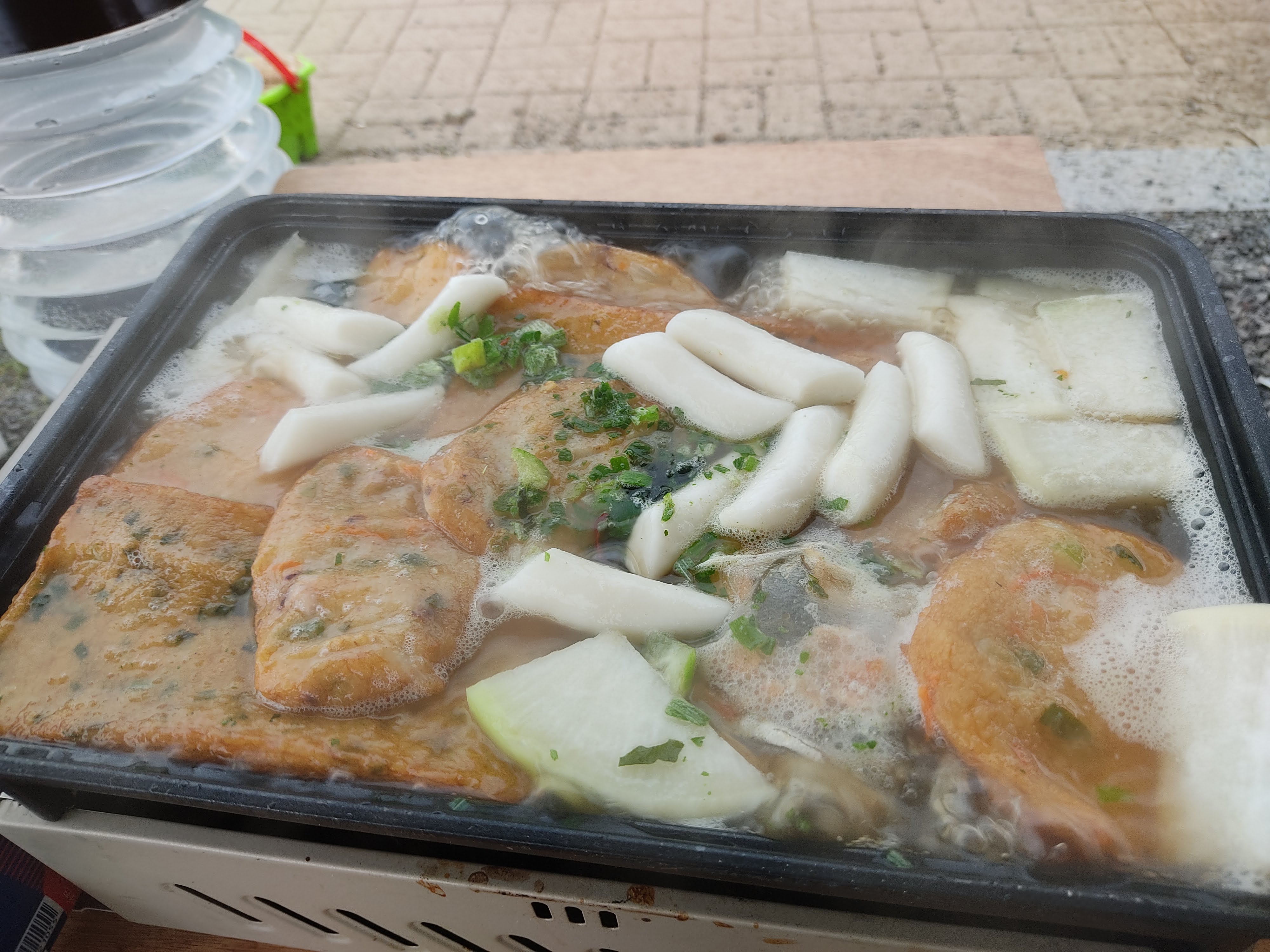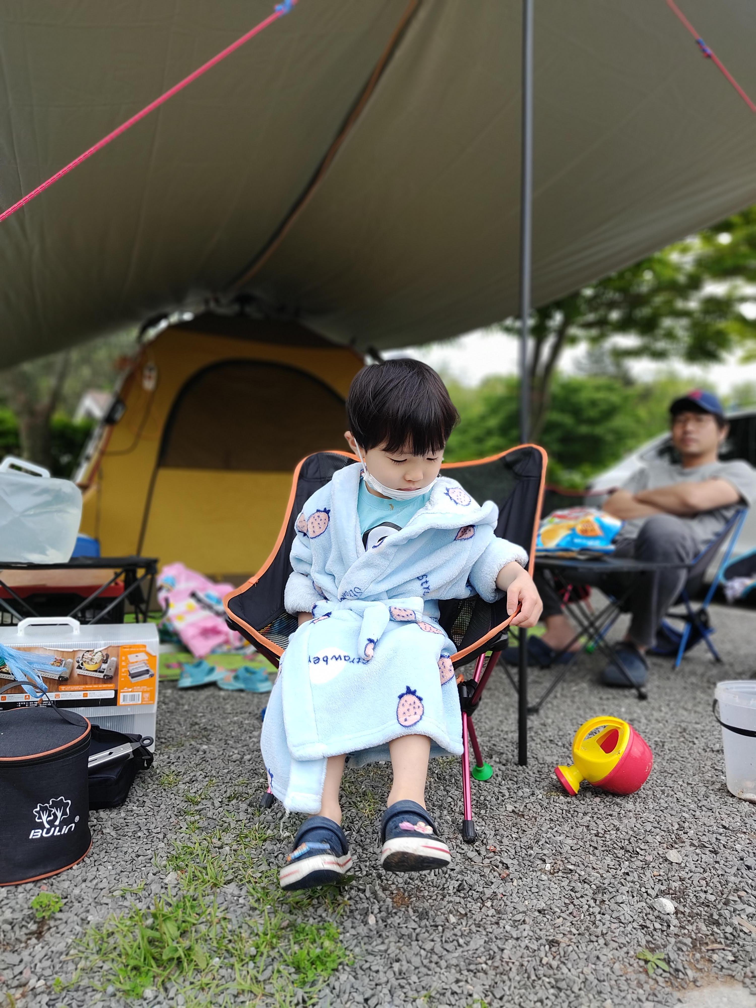 구름이 끼더니 역시나 비가 오네요~ 후다닥 텐트로 돌아옵니다. 아이들은 목욕 가운을 입고 따듯하게 어묵탕으로 몸을 녹입니다!