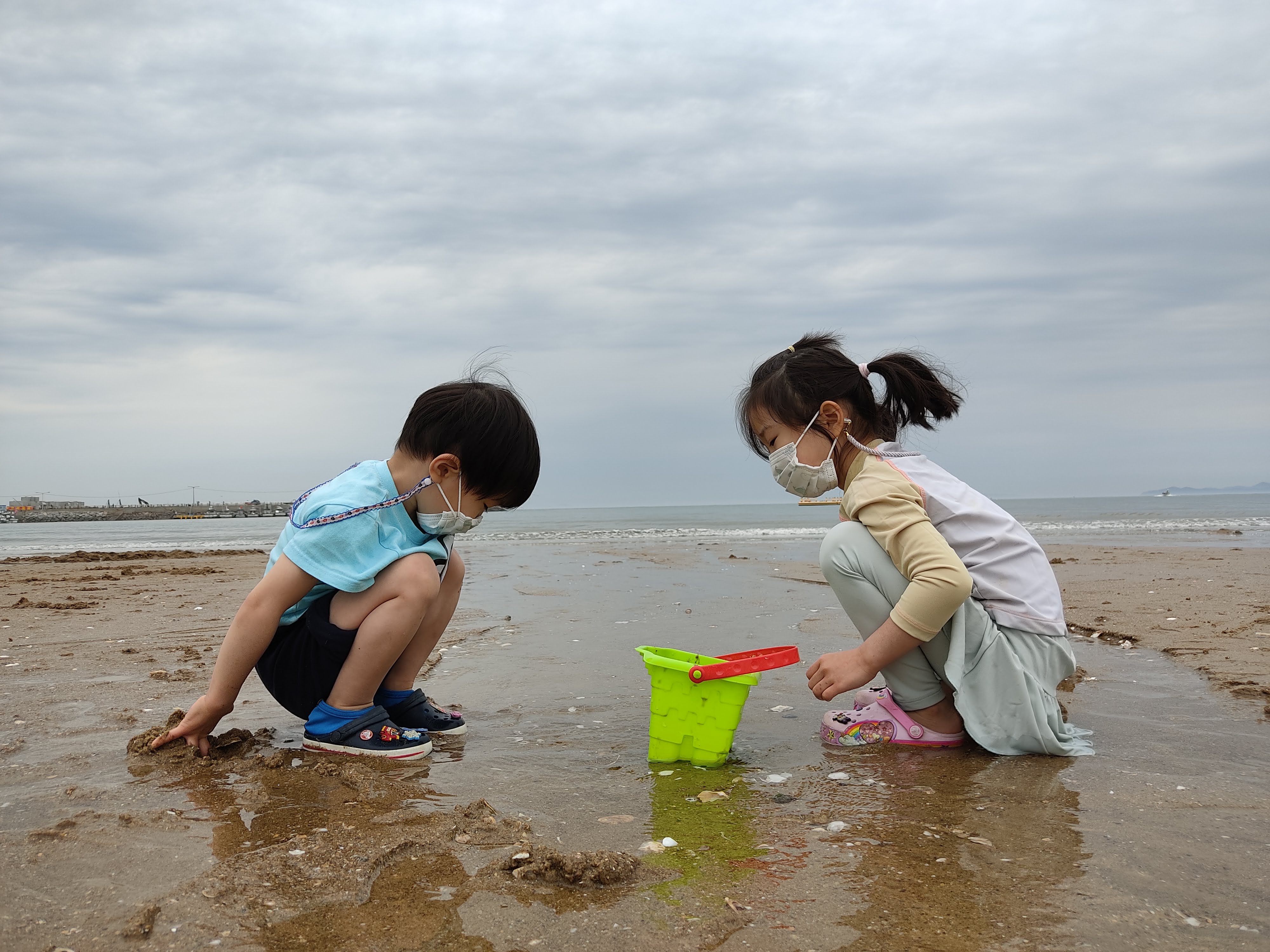 아이들은 예쁜 조개 찾기 놀이를 시작합니다.