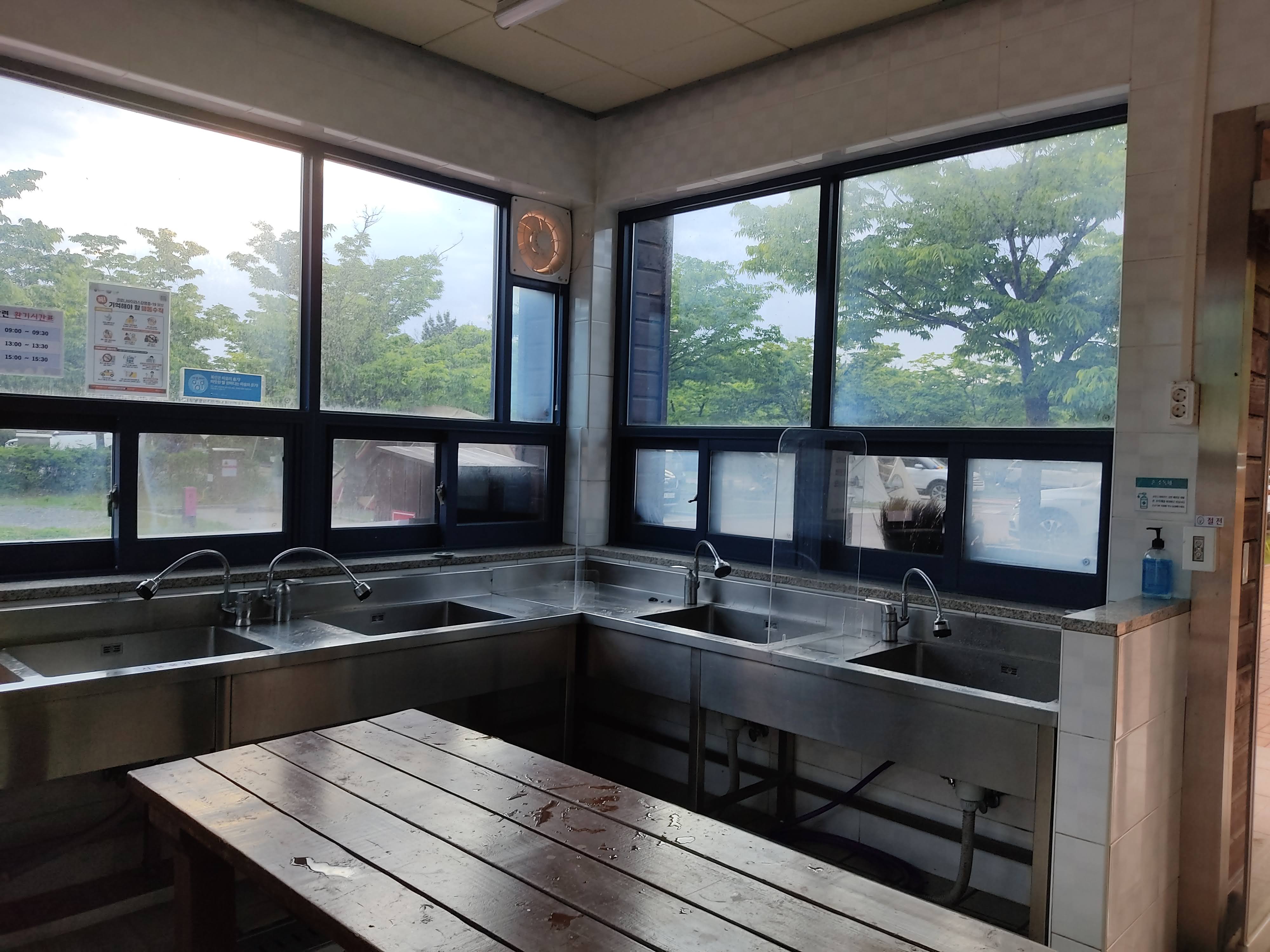 취사장은 깔금하고 방역에 맞게 취사장 역시 안전하게 칸막이를 두고 있습니다. 아쉽게 따듯한 물은 안 나옵니다.