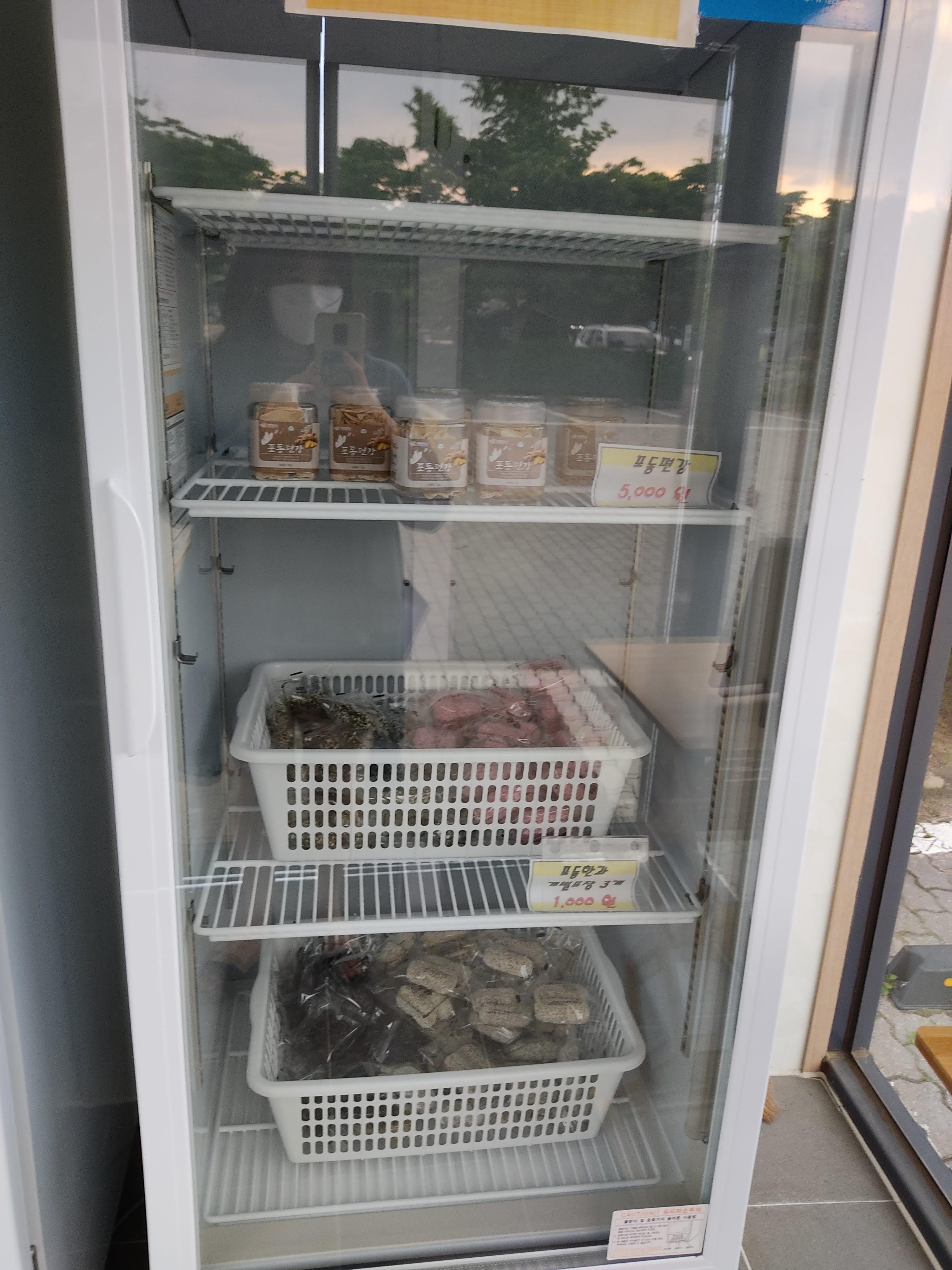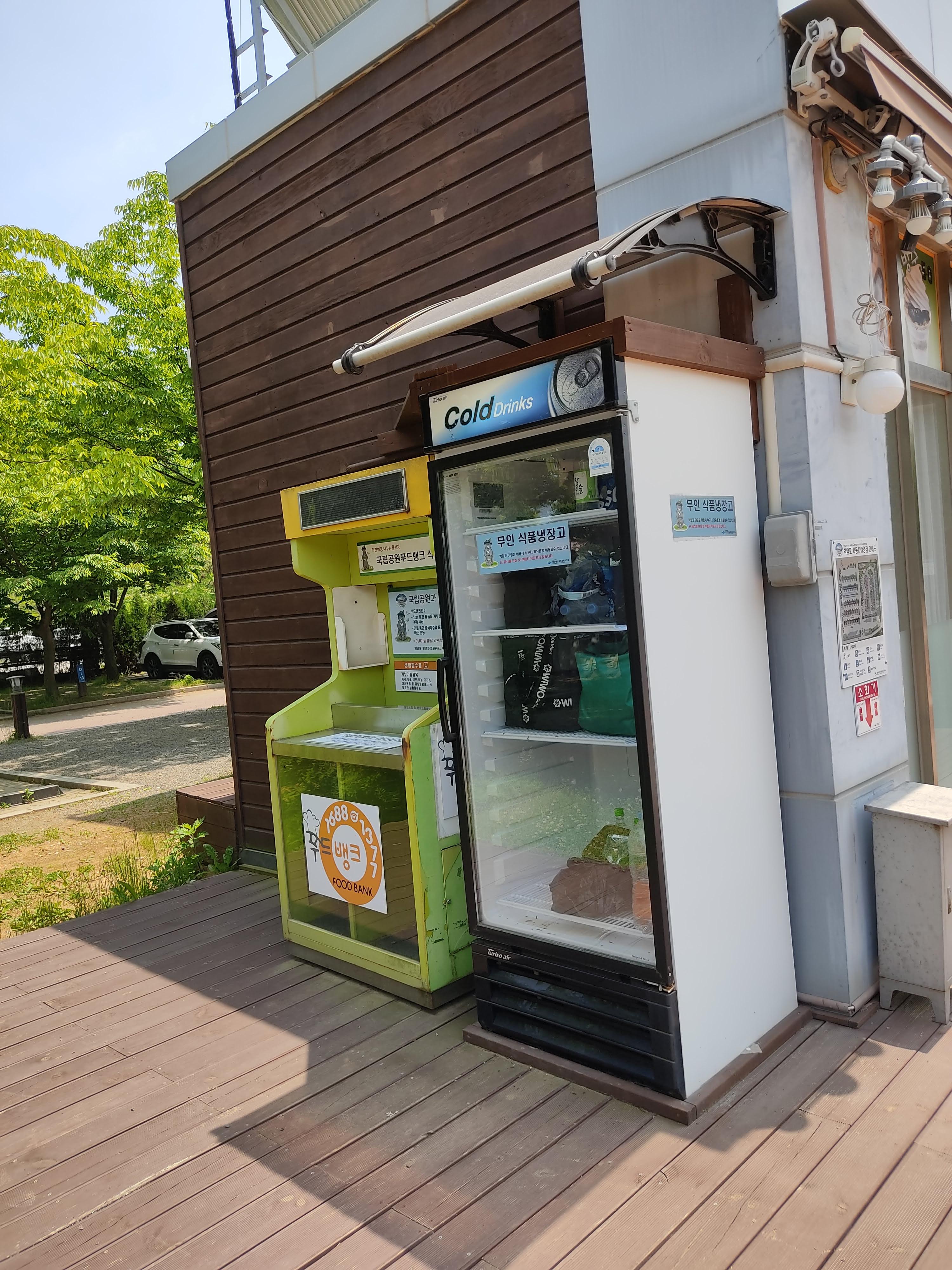 도난의 위험은 있지만 캠핑용 냉장고가 없으신 분들은 무인 냉장고를 활용할 수 있어요. 옆에 식품 기부함도 있어요