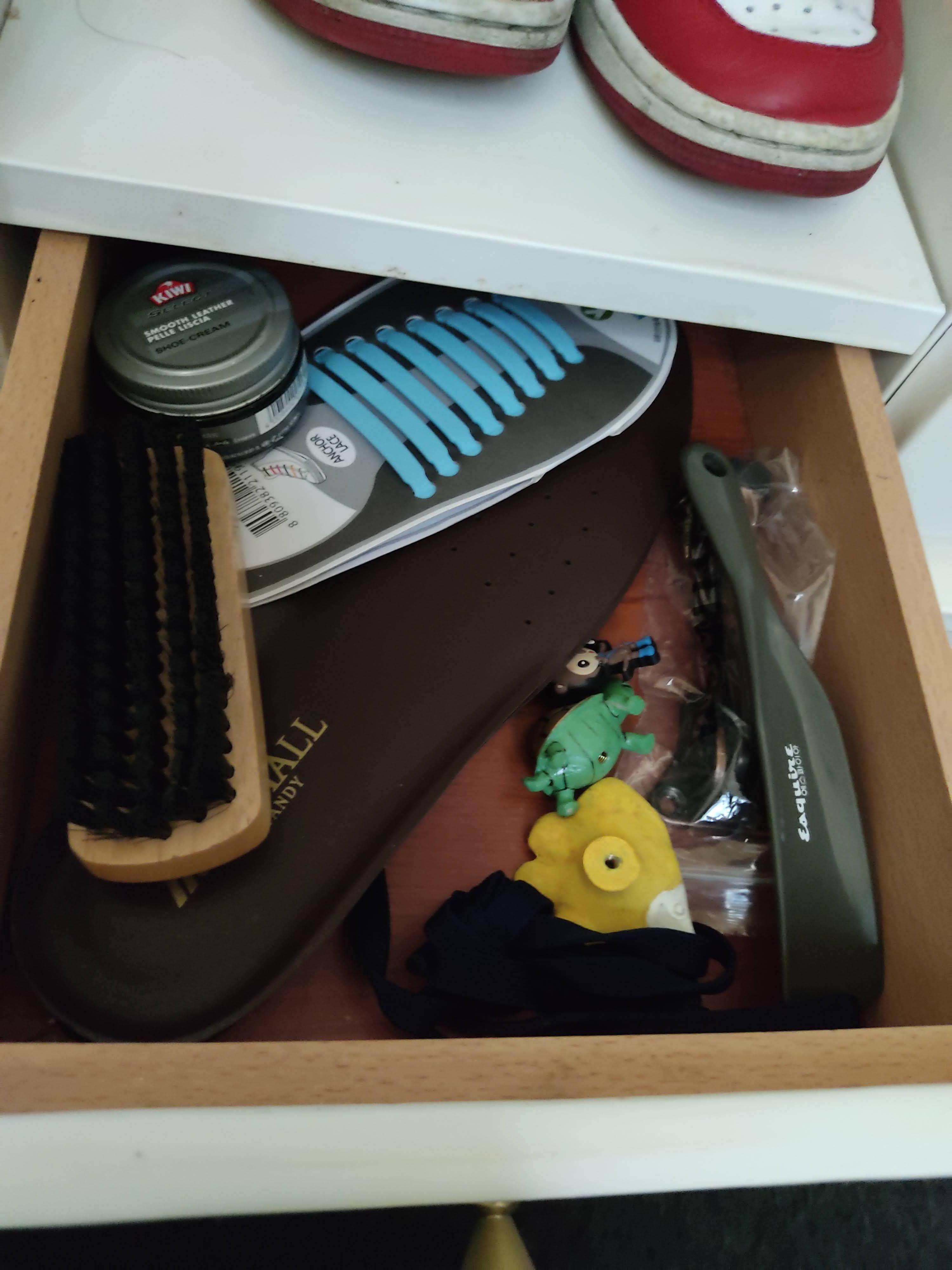 원래 작은 신발장의 서랍과 레일을 꺼내 사이즈에 맞게 리폼해준 후 달아주어 소소하게 신발장 근처에 꼭 필요한 구둣솔 , 신발, 깔창, 신발끈 같은 것들을 모아줍니다.