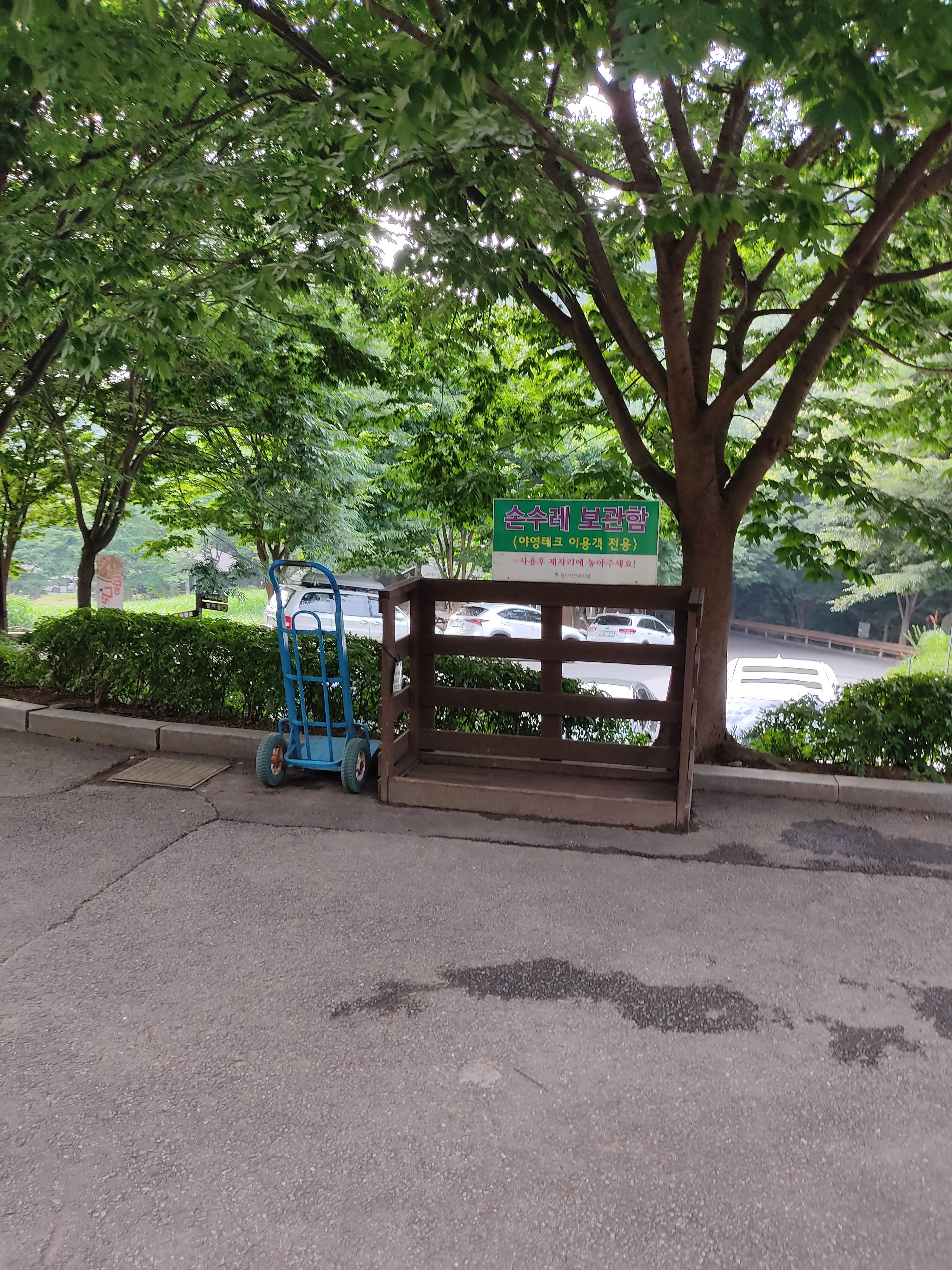 주차장 앞 언덕 위쪽에 캠핑객들을 위해 손수레가 있으니 활용하세요.