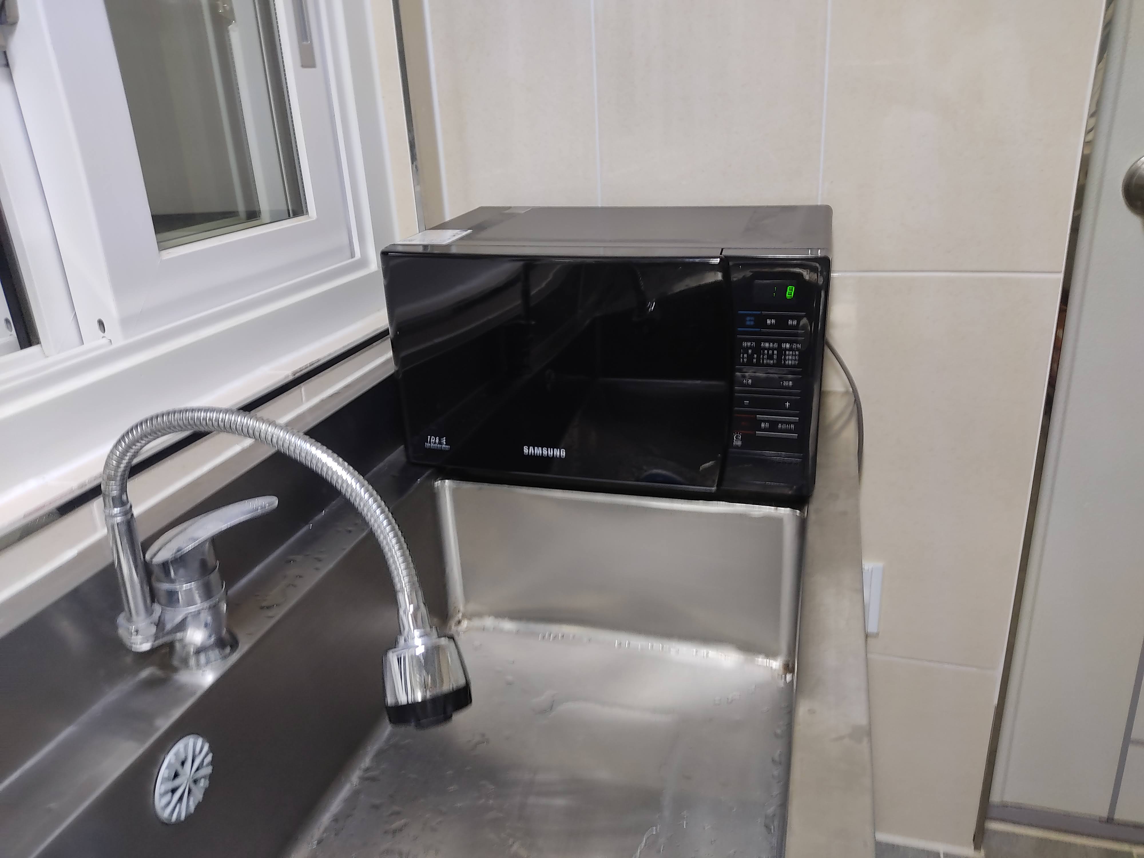 개수대도 관리가 잘된 데다가 온수도 나옵니다! 그리고 전자레인지도 있어요