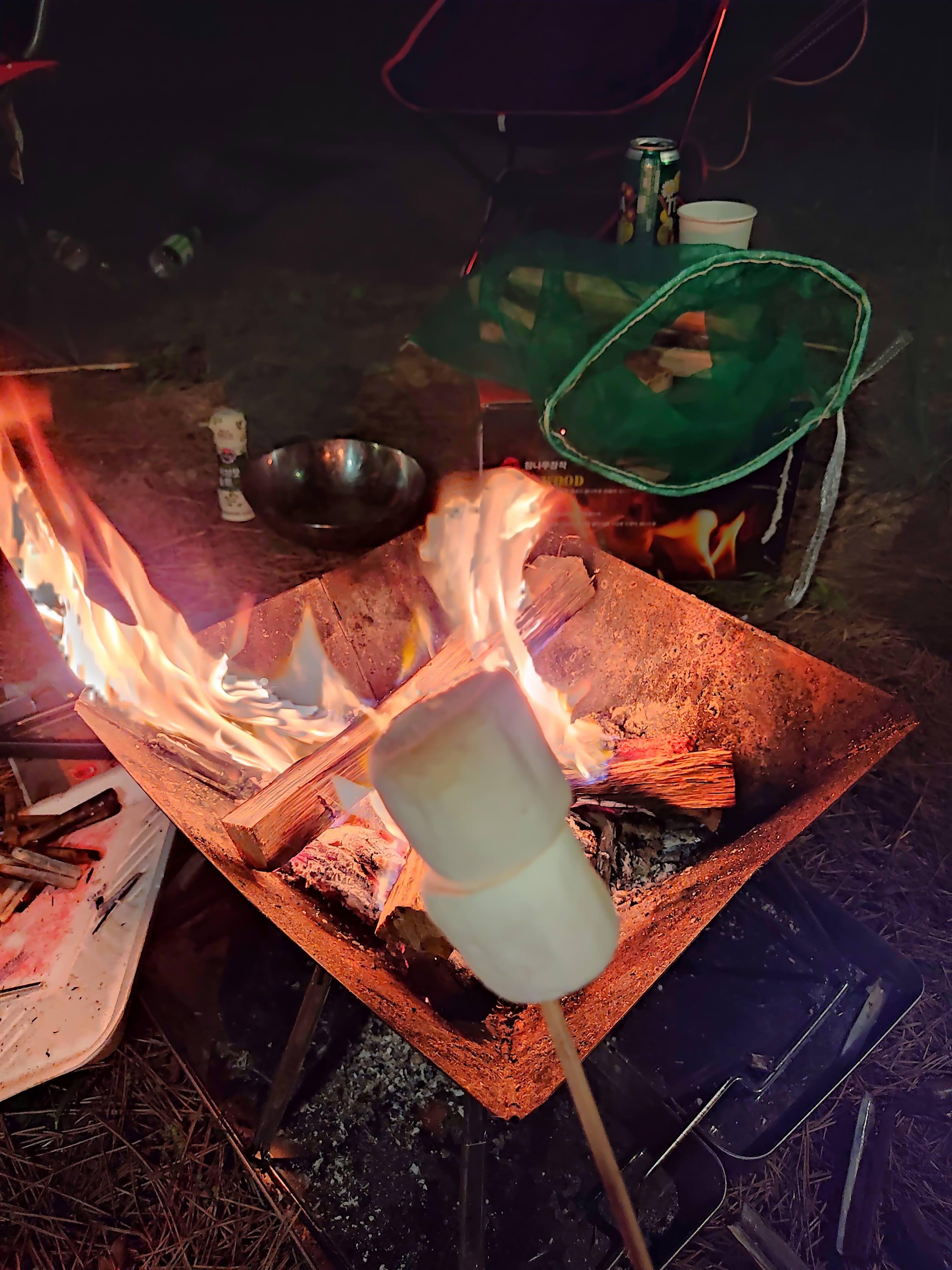 노릇하게 익혀 겉은 바삭 안은 사르르 녹는 마시멜로우를 구워 먹는 것도 '캠핑의 낭만'입니다.