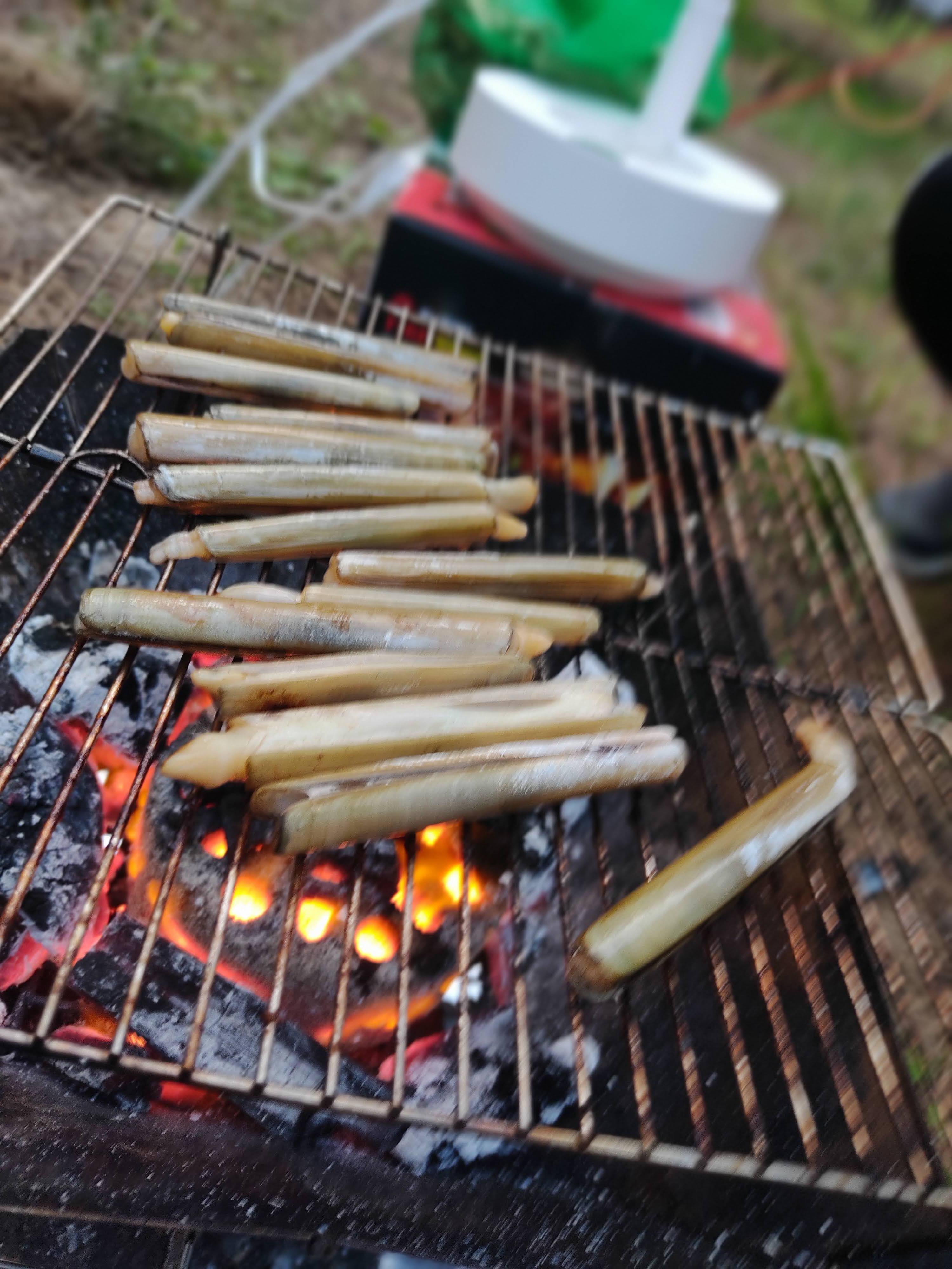 저희보다 먼저 도착했던 친구는 맛조개를 양동이를 가득 잡았습니다! 얼마나 맛있길래 이름이 맛조개 일까 하고 냅다 숯불에 얹어봅니다.