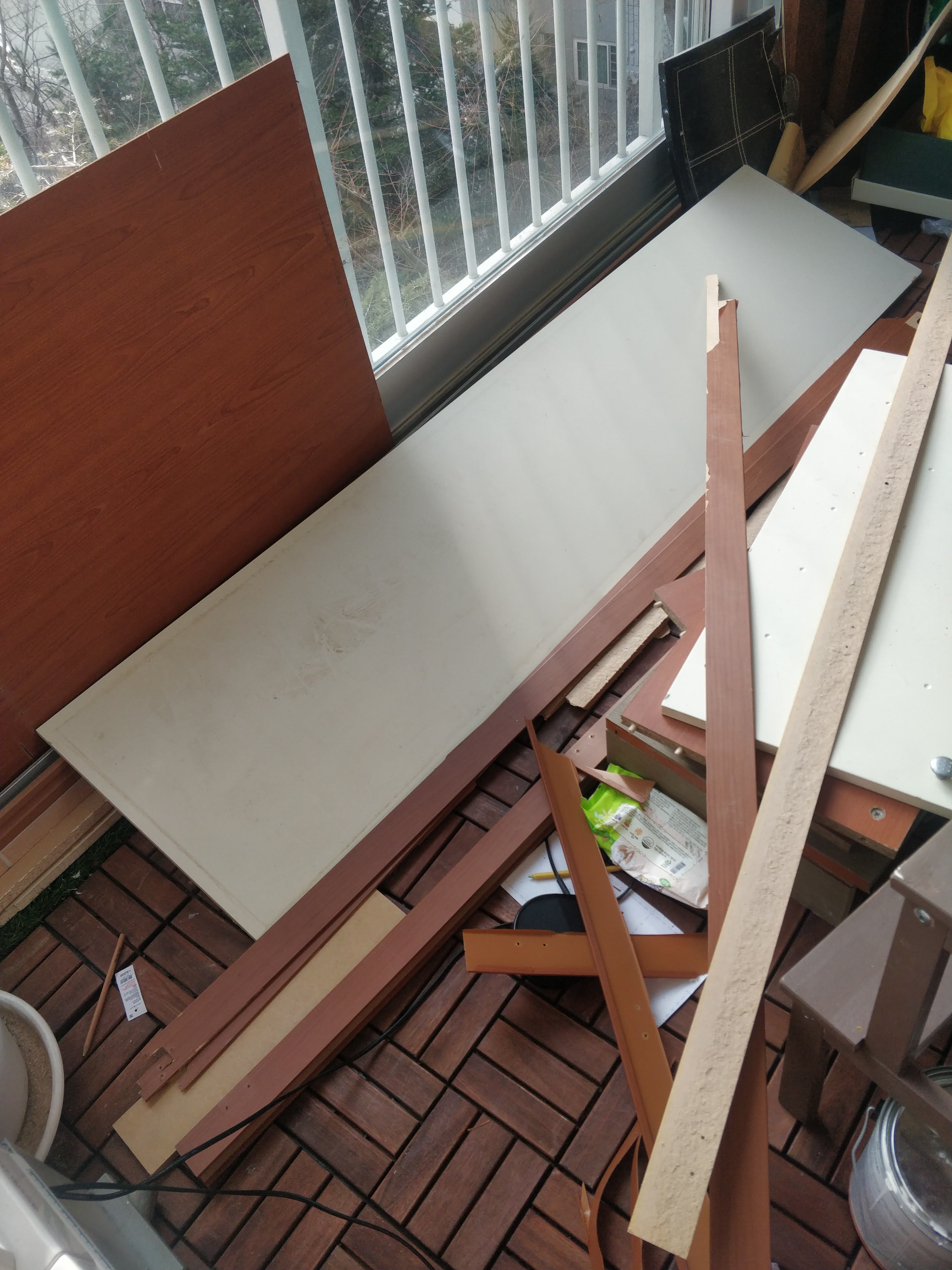 한참 고민을 하던 중 눈에 들어온 신발장을 고치고서도 남은 자투리 목재들 이 보입니다. 문짝을 분리 후에 남은 이 목재를 잘 뜯어내면 얇고 일정한 목재가 나오네요. 이걸로 격자형 웨인스코팅을 하려 합니다.
