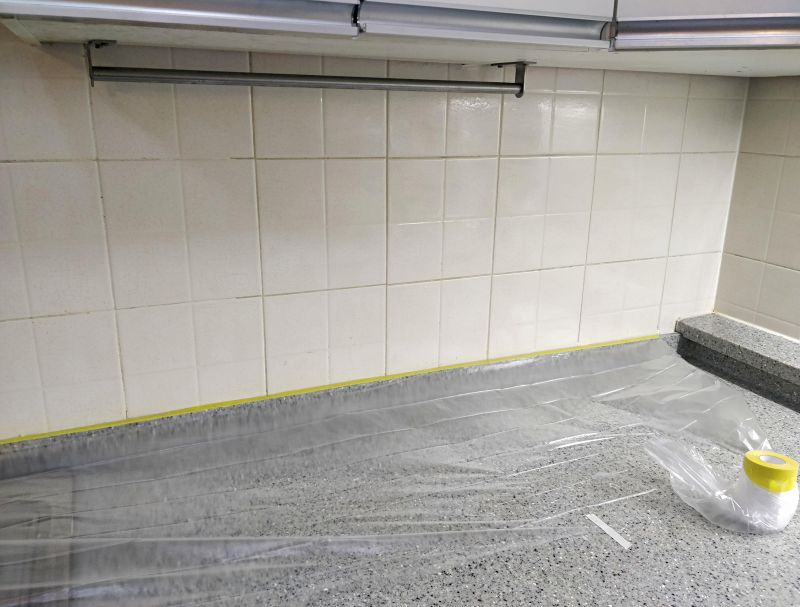 모든 셀프 인테리어에서 가장 중요한 건 사전작업이에요. 타일 역시 덧방 할 벽면이 이물질이 없고 작업 시에 불필요한 물건을 제거해야 합니다. 실리콘을 모두 제거해 주고 주방 근처에 물건을 치운 뒤 아래에 마스킹 비닐테이프를 둘러줍니다.
