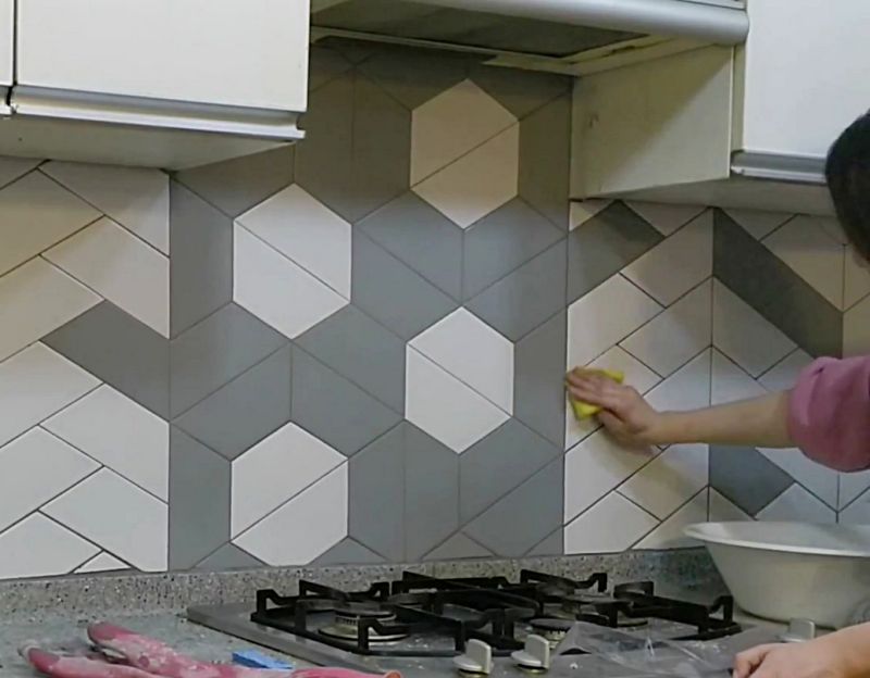 저에 경우는 가장 쉽게 더러워지는 가스레인지 앞 공간은 어두운 회색이 많이 들어가게 하기 위해 헥사곤 무늬를 만들었고 다른 곳은 화이트 색상이 많이 들어간 헤링본 무늬를 넣을 생각입니다. 하프 헥사곤 타일의 패턴이 궁금하시다면 이전 포스팅(링크)을 참고하세요.