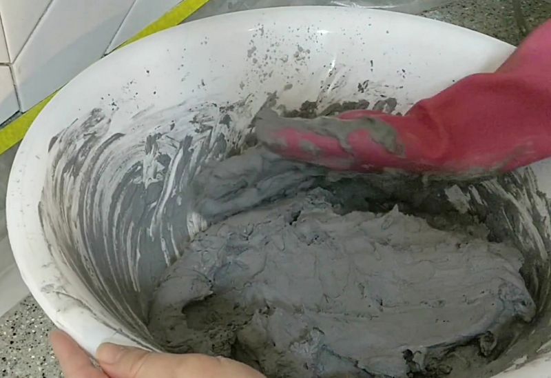 - 시공하기 전 시멘트를 반죽해야 하는데요, 사진에 보다시피 약간 치약 정도의 점도를 만들어주시면 됩니다. 시멘트에 물을 조금씩 부어 천천히 섞어가며 점도를 맞춰주세요. 시멘트는 피부에 좋지 않기 때문에 꼭 고무장갑을 끼고 하세요.