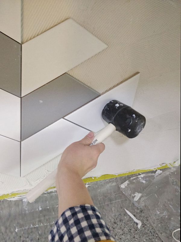 타일을 붙이는 방법은 패턴에 맞게 타일을 배치하고 고무망치로 '톡톡' 쳐주면 됩니다. 타일을 붙일 때 가장 중요한 건 타일이 전체적인 면이 울퉁불퉁하지 않게 잘 맞춰서 작업해주시는 거예요. 여러 각도에서 보며 평평하게 붙여주세요.