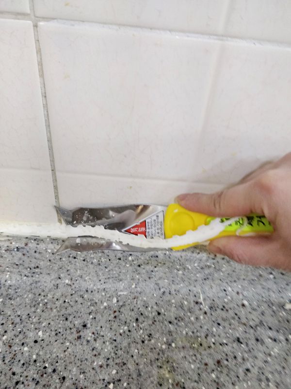 모든 셀프 인테리어에서 가장 중요한 건 사전작업이에요. 타일 역시 덧방 할 벽면이 이물질이 없고 작업 시에 불필요한 물건을 제거해야 합니다. 실리콘을 모두 제거해 주고 주방 근처에 물건을 치운 뒤 아래에 마스킹 비닐테이프를 둘러줍니다.